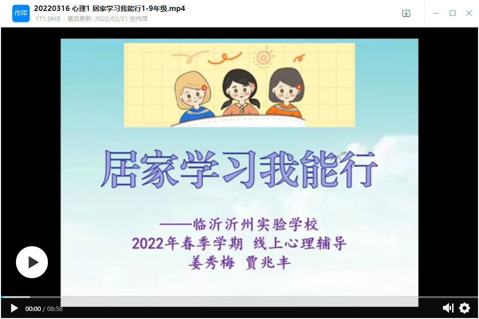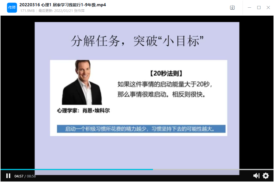 居家學(xué)習(xí)和在校學(xué)習(xí)有很多不同,學(xué)生也會(huì)面臨一些新的挑戰(zhàn),比如網(wǎng)絡(luò)不順暢,聽(tīng)課不清晰;作業(yè)拍照上傳光線不合適等等,會(huì)讓家長(zhǎng)和孩子產(chǎn)生焦慮情緒,那如何調(diào)整做好居家學(xué)習(xí)呢?賈老師向同學(xué)們介紹了居家學(xué)習(xí)的小妙招,并通過(guò)生動(dòng)的朝三暮四小視頻故事,讓學(xué)生學(xué)會(huì)控制心中的“猴”。在策略方面,賈老師介紹了分解任務(wù),突破小目標(biāo)的20秒法則。同學(xué)們認(rèn)真學(xué)習(xí),掌握了一定的方法和策略。