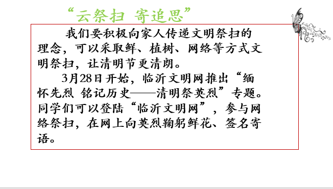 4月5日是我國(guó)的傳統(tǒng)節(jié)日清明節(jié),為讓學(xué)生更好的了解清明節(jié)知識(shí),文明祭祀,沂州實(shí)驗(yàn)學(xué)校 3月28日下午舉行了線上“講文明 增清氣”清明節(jié)主題隊(duì)會(huì)。