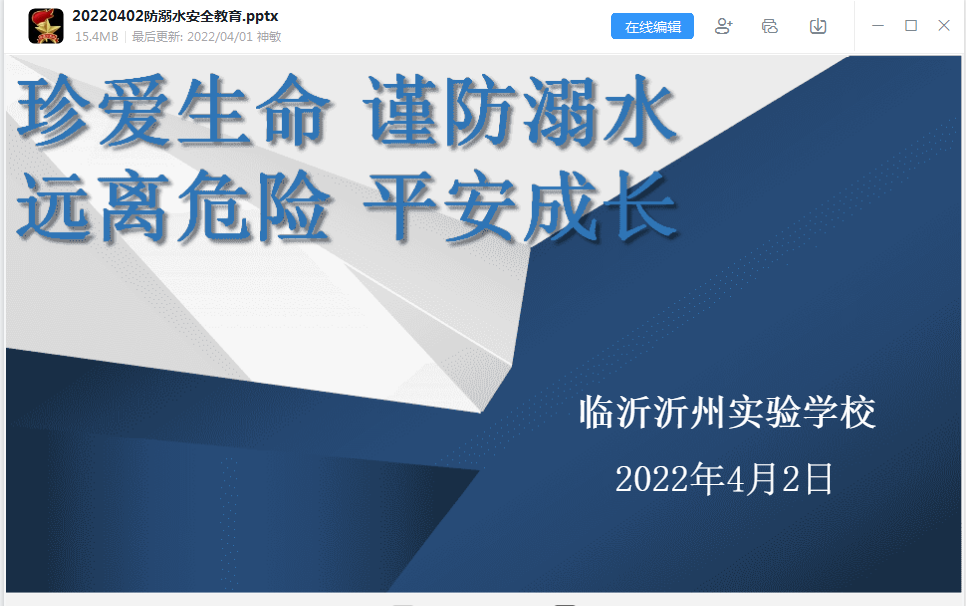 政教處及時制作了班會課件,各年級于4月2日下午開展了線上安全班會課,主題為“珍愛生命 謹防溺水 遠離危險 平安成長”。
