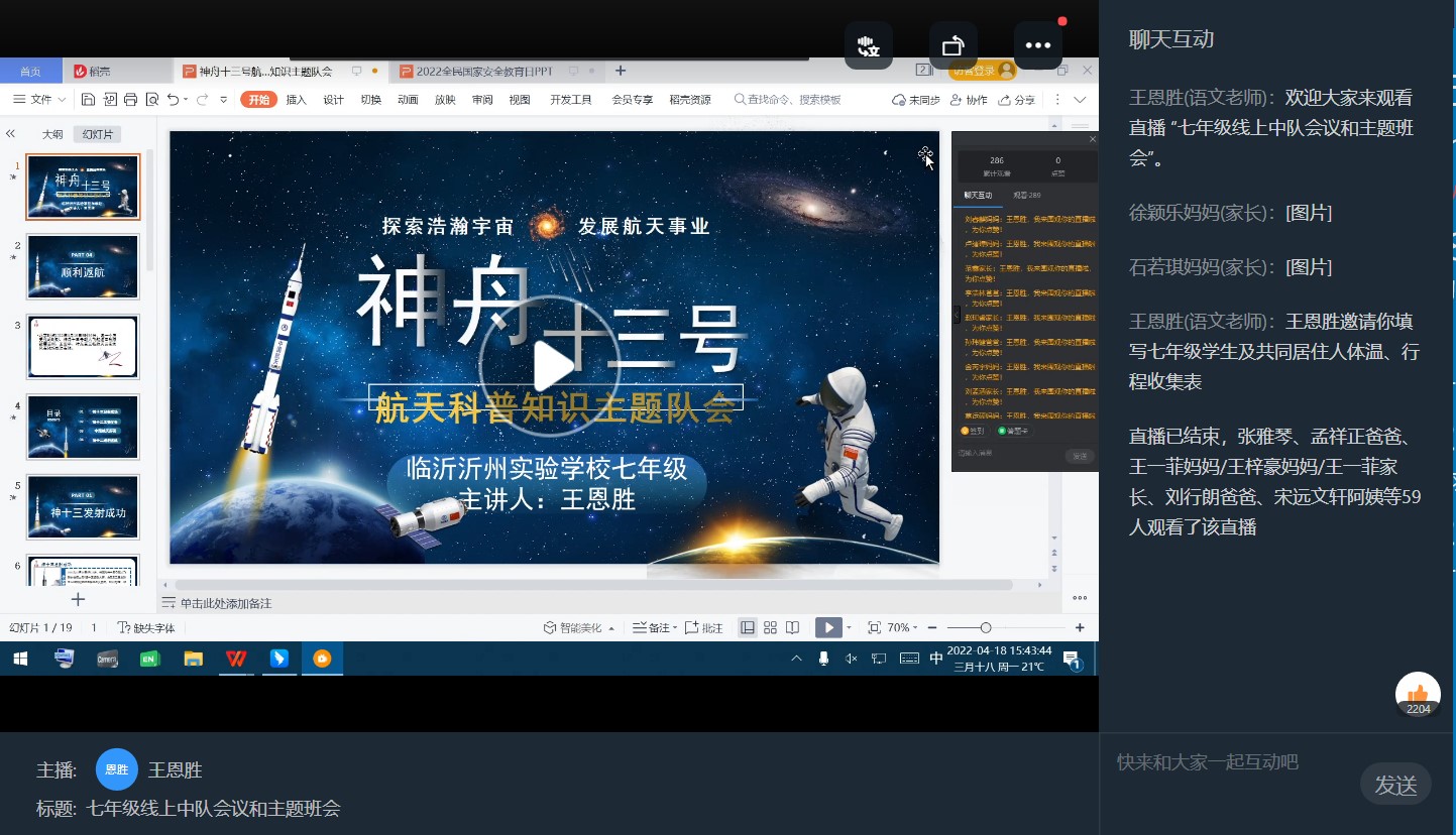 為更好地讓少先隊員了解我國航天成就,在學(xué)生心中播下“航天夢”的種子,切實了解中國科技發(fā)展,增強民族自豪感。4月18日,我校6-8年級利用周一班會時間,以神舟十三號載人飛船的返回為契機,組織少先隊員觀看發(fā)射實況,感受我國載人航天精神。