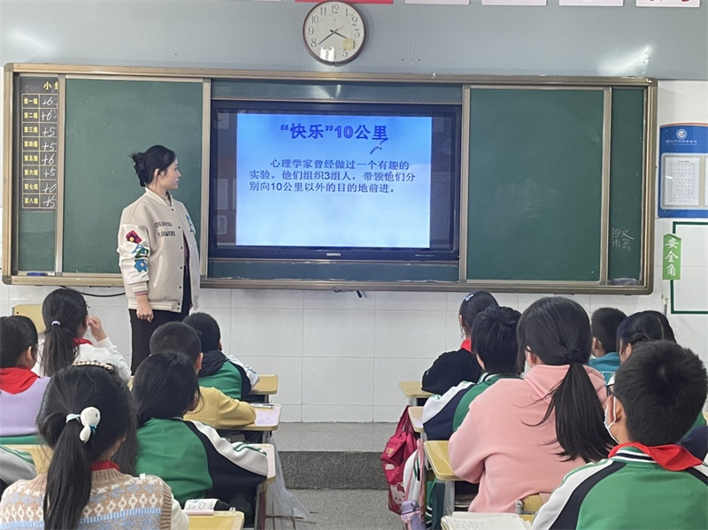 賈老師先向同學(xué)們講述了“快樂(lè)”10公里的故事,讓大家明白走長(zhǎng)路的秘訣其實(shí)就是一步一個(gè)腳印,要肯定自己走過(guò)的每一步;學(xué)習(xí)也是一樣的,愛(ài)上學(xué)習(xí)、快樂(lè)學(xué)習(xí)的秘訣之一就是把學(xué)習(xí)任務(wù)分解成“小碎步”。接著,賈老師又介紹了“朝三暮四”的故事及心理學(xué)家肖恩·埃科爾的“20秒法則”,希望同學(xué)們?cè)趯W(xué)習(xí)時(shí),學(xué)會(huì)分解任務(wù),不斷突破小目標(biāo),積累成功!