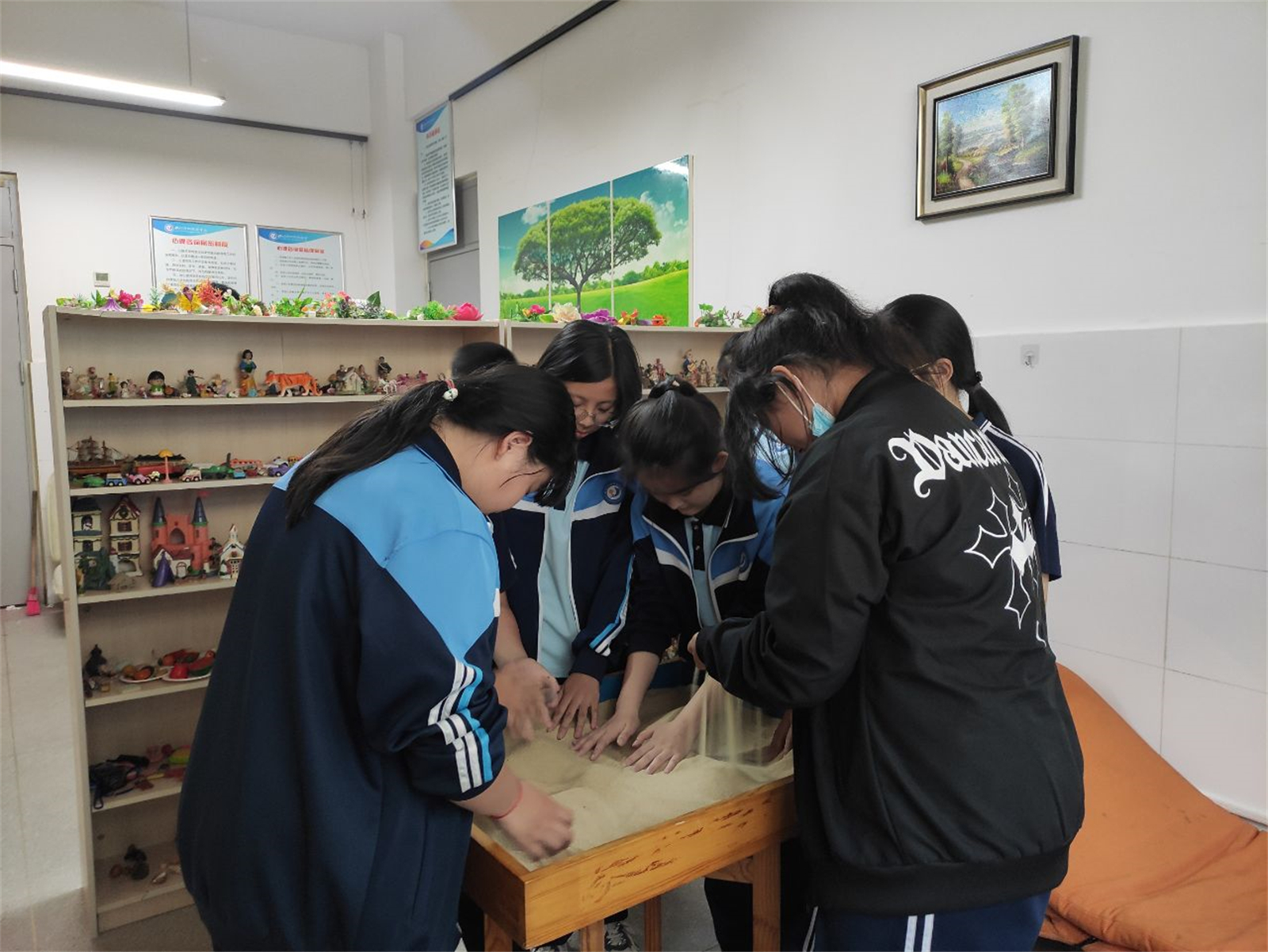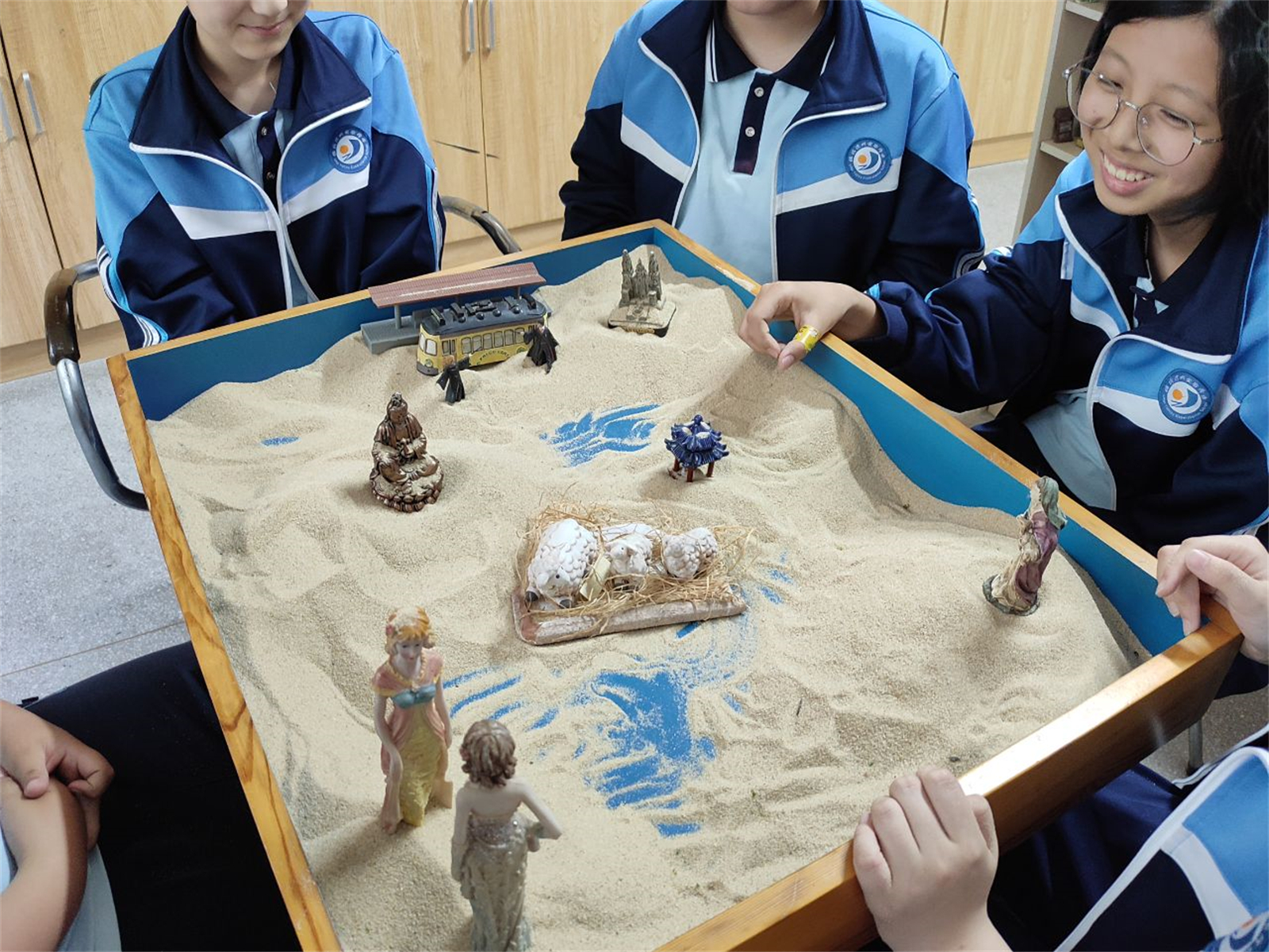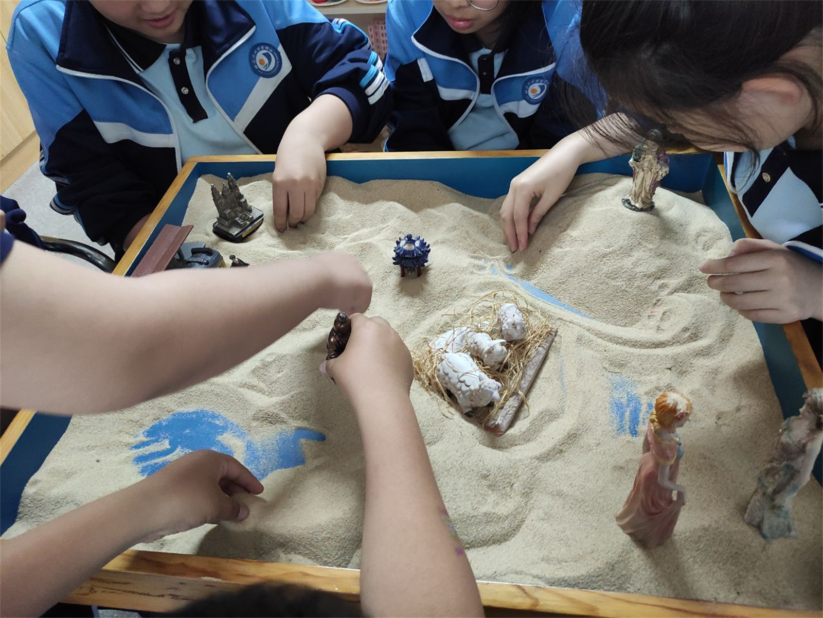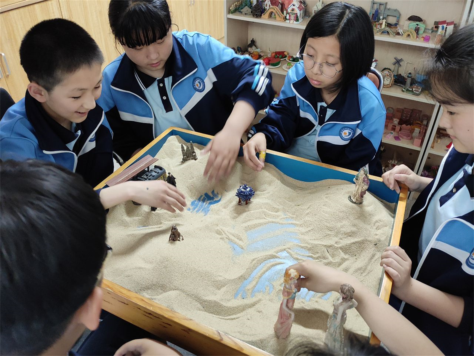 “一沙一世界”,一個(gè)個(gè)沙世界在同學(xué)們的手中呈現(xiàn),同學(xué)們?cè)隗w驗(yàn)創(chuàng)作樂趣的同時(shí)放松身心、探索自我、了解他人、深入交流,學(xué)會(huì)了傾聽他人、尊重接納,促進(jìn)了自我成長(zhǎng)與良好人際關(guān)系的建立,從而提升了心理健康水平。