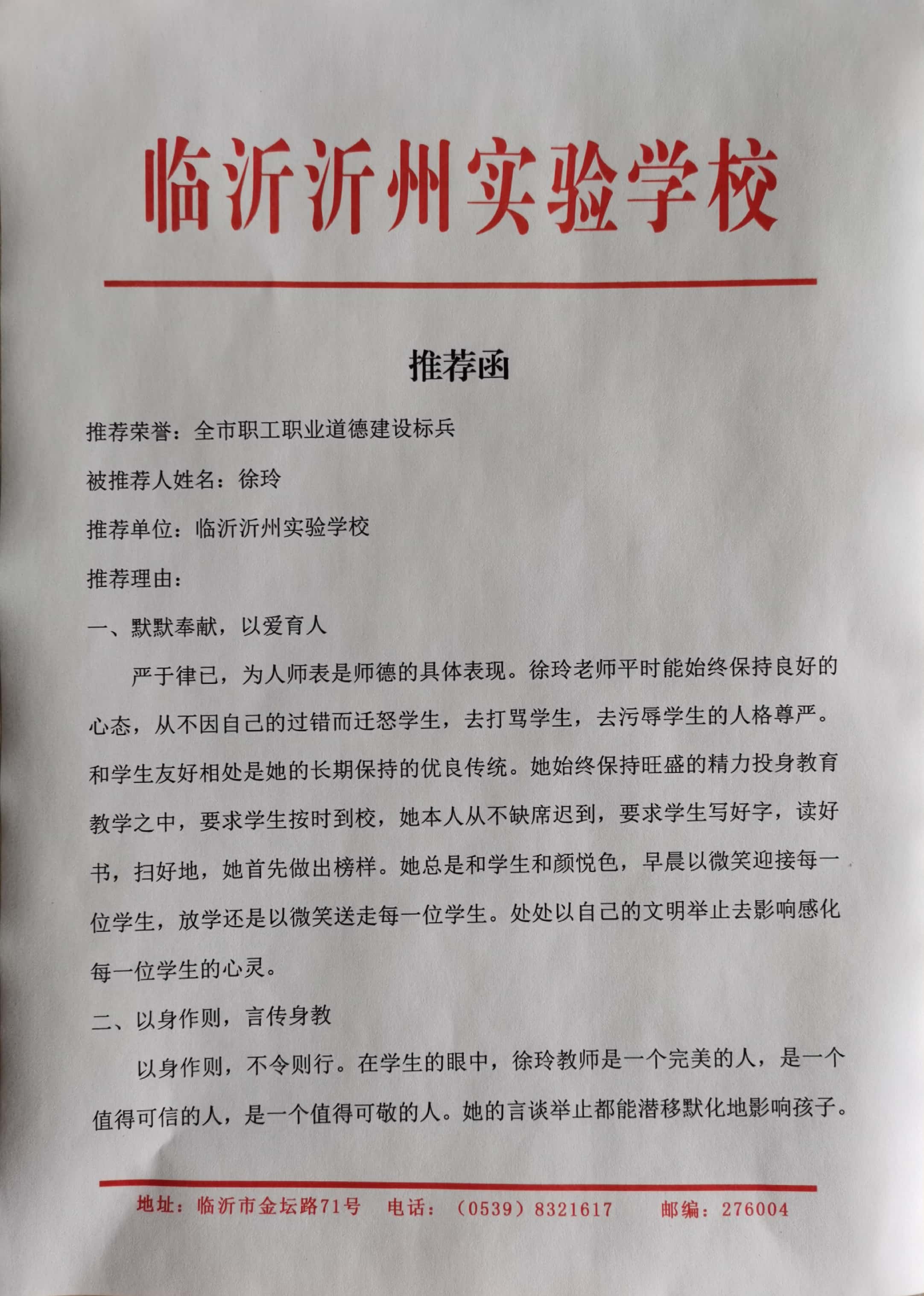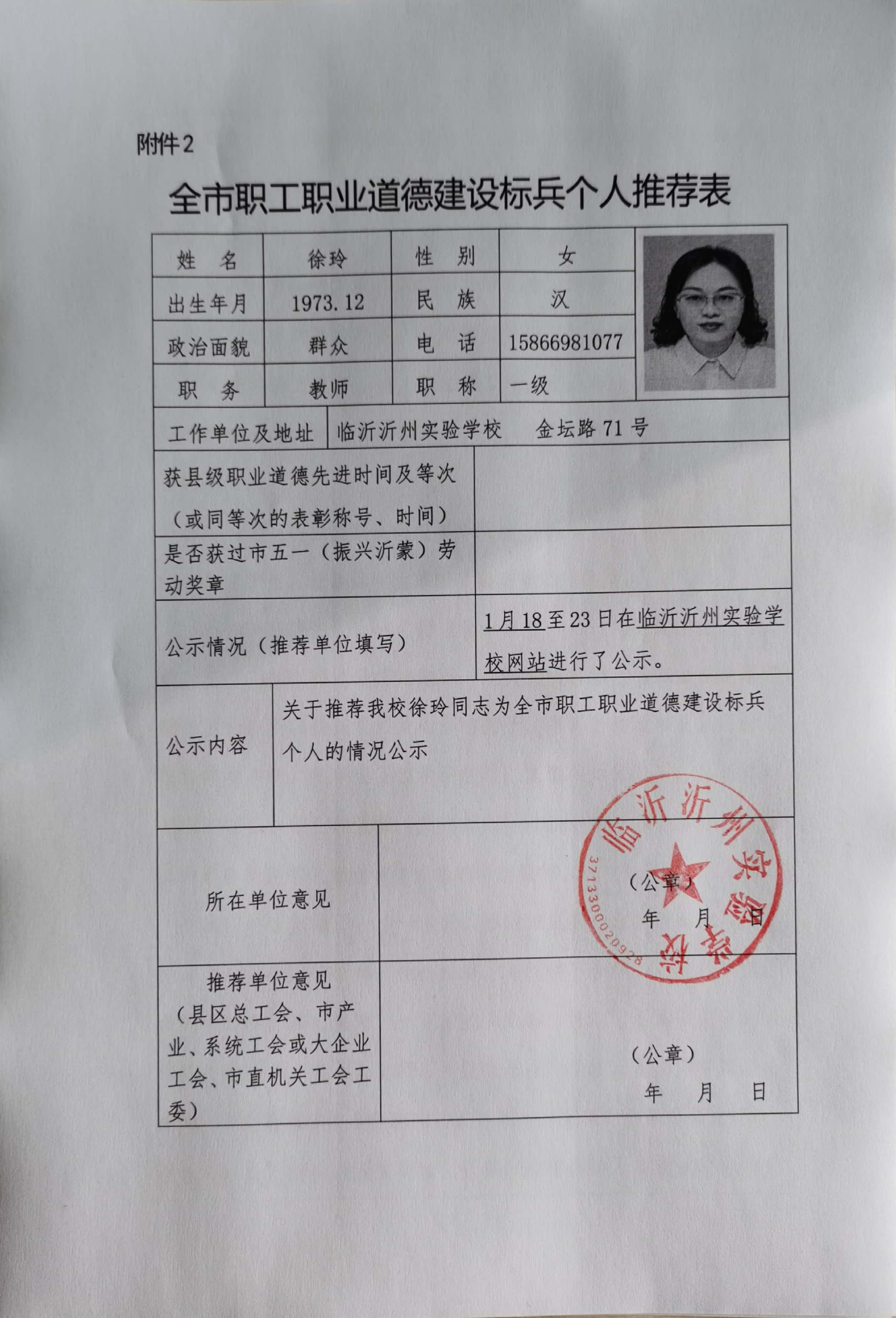 關于推薦我校徐玲老師為全市職工職業(yè)道德建設標兵的公示