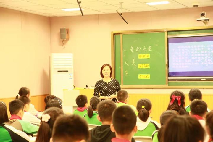 云鳳玲副主任執(zhí)教的是五年級(jí)經(jīng)典課文《鳥(niǎo)的天堂》,這是一篇巴金先生描寫(xiě)自然景物的文章。她以作者的描寫(xiě)順序?yàn)橹骶€,作者兩次去往鳥(niǎo)的天堂看到了不同的景象,描寫(xiě)看似凌亂實(shí)際清晰有序,強(qiáng)調(diào)順序詞語(yǔ)起到的關(guān)鍵性作用,讓學(xué)生感受到巴金先生作為一名語(yǔ)言大師用詞的巧妙之處。她還通過(guò)作者根據(jù)不同景物的特點(diǎn)采用不同的描寫(xiě)方法,讓學(xué)生在對(duì)比閱讀中體會(huì)靜態(tài)描寫(xiě)與動(dòng)態(tài)描寫(xiě)結(jié)合的絕妙之處。在拓展延伸部分,給予學(xué)生充分的閱讀思考時(shí)間,讓學(xué)生運(yùn)用學(xué)習(xí)到的寫(xiě)作順序和動(dòng)靜描寫(xiě)的方法,閱讀巴金先生的《筑渝道上》,進(jìn)一步夯實(shí)訓(xùn)練點(diǎn)。