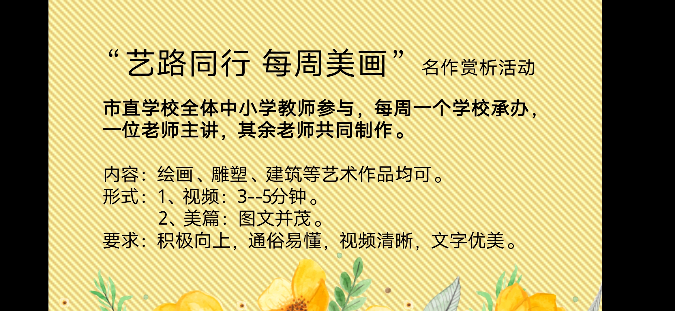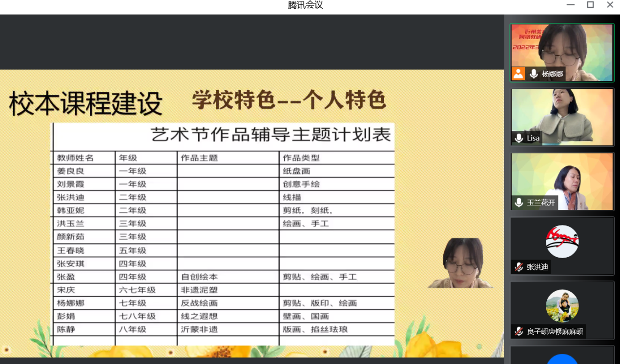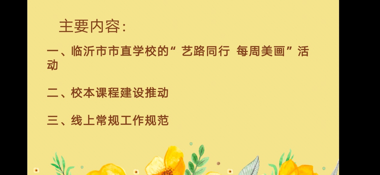 會(huì)議內(nèi)容分為三個(gè)部分。會(huì)議首先對(duì)臨沂市市直學(xué)校的“藝路同行,每周美畫”活動(dòng)進(jìn)行了介紹和解讀。接著,針對(duì)校本課程建設(shè)推動(dòng)開展情況,各位老師圍繞自己開展的美術(shù)特色校本課程進(jìn)行線上交流與分享。最后,楊老師特別對(duì)市教育局發(fā)布的《臨沂市中小學(xué)美術(shù)學(xué)科線上教學(xué)教研工作指導(dǎo)意見》進(jìn)行解讀,強(qiáng)調(diào)美術(shù)線上常規(guī)工作規(guī)范,優(yōu)化小學(xué)美術(shù)線上教學(xué)內(nèi)容和方法的選擇運(yùn)用,科學(xué)嚴(yán)謹(jǐn)?shù)芈鋵?shí)美術(shù)學(xué)科教學(xué)計(jì)劃和目標(biāo),用生動(dòng)有趣的美術(shù)創(chuàng)作和實(shí)踐活動(dòng),最大限度地豐富學(xué)生居家學(xué)習(xí)的文化生活,通過精美的圖片與材料,分享經(jīng)驗(yàn),互動(dòng)交流,力求發(fā)揮線上教研最大的優(yōu)勢。并且對(duì)藝術(shù)節(jié)作品的準(zhǔn)備和省課市直賽課這些事情做了精密的部署,相信這些工作都將會(huì)有條不紊的陸續(xù)開展!
