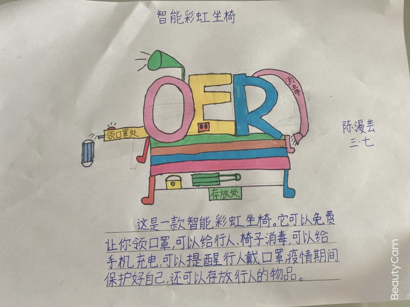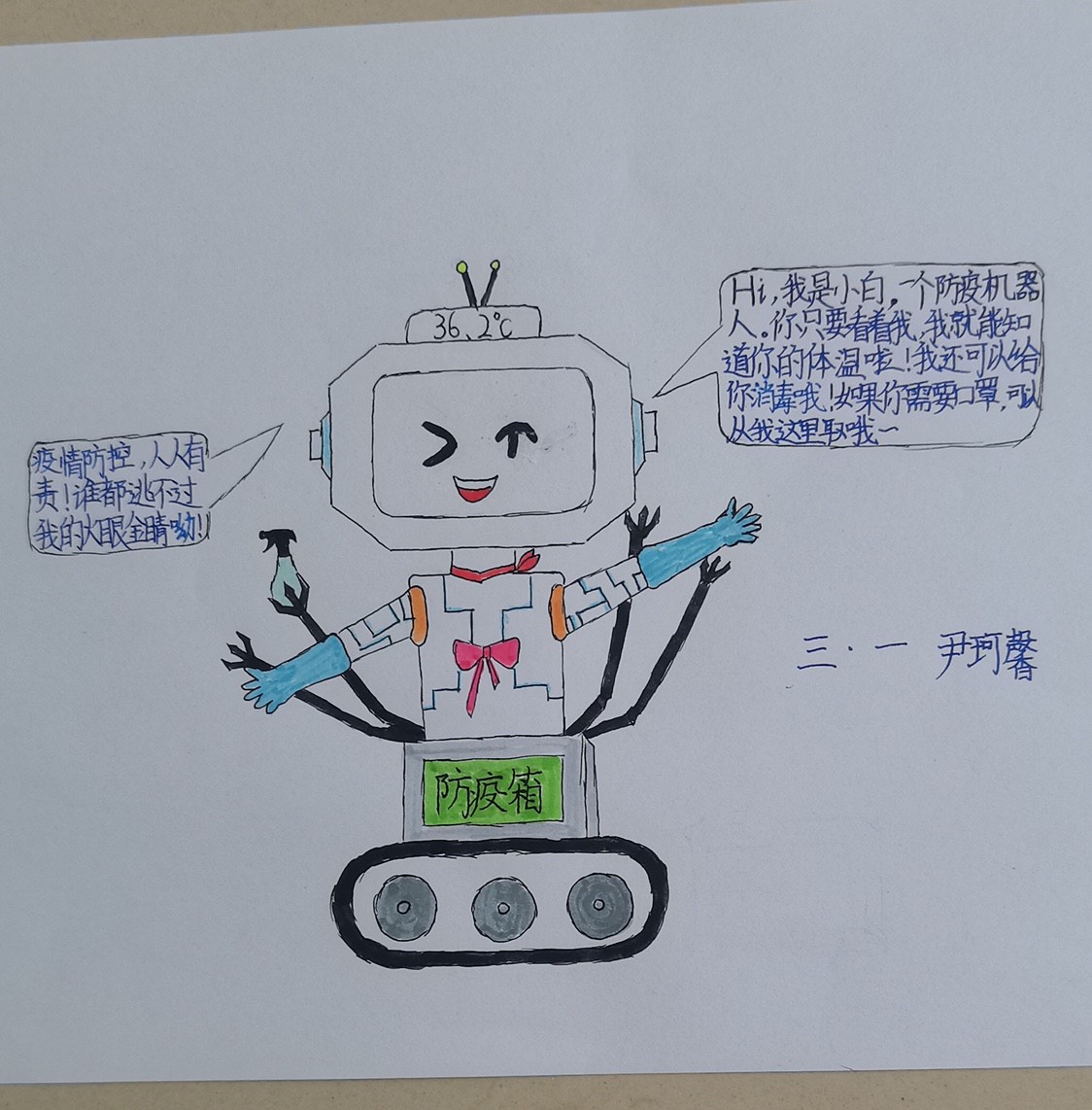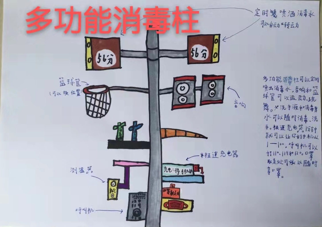 從他們的設(shè)計(jì)里,有集領(lǐng)口罩、測(cè)溫、充電、消毒于一體的智能彩虹座椅;有集娛樂、便民、消毒于一體的多功能消毒柱,有為了出行的安全與方便設(shè)計(jì)出能顯示行程與溫度的帽子的;有提示口罩已無保護(hù)作用的智能口罩;還有同學(xué)專門為醫(yī)護(hù)工作者們?cè)O(shè)計(jì)機(jī)器人,解決疫情之下他們無瑕顧忌自己孩子看護(hù)、飲食、監(jiān)控與輔導(dǎo)等問題的...無盡的創(chuàng)意里包含著滿滿的責(zé)任與擔(dān)當(dāng)!看到孩子們一張張別出心裁又為民著想的設(shè)計(jì),突然感覺疫情之下的他們,在我們的精心指導(dǎo)下不僅是富有創(chuàng)造力的一代,也成了關(guān)心國(guó)家、社會(huì)、民生、環(huán)境與醫(yī)療有使命感的一代。相信在不久的將來,這些美妙新奇的設(shè)計(jì)都會(huì)變?yōu)楝F(xiàn)實(shí)!
