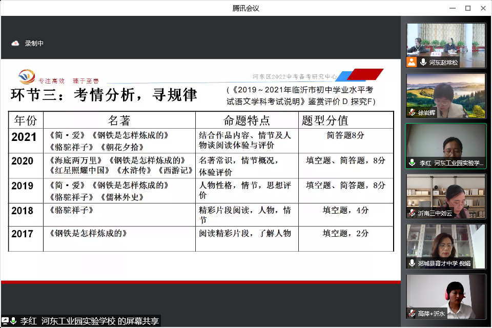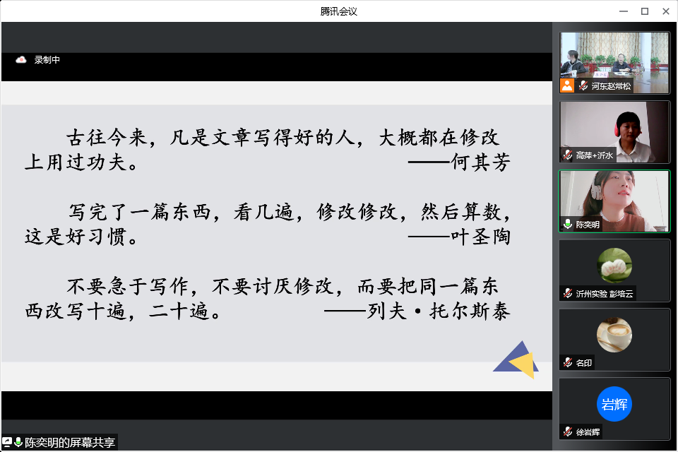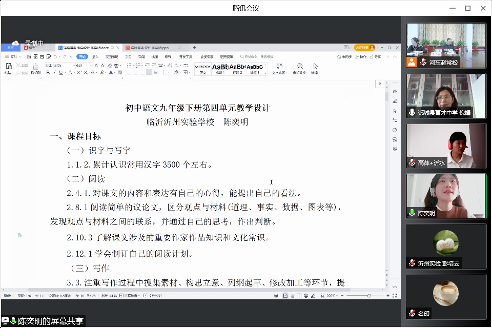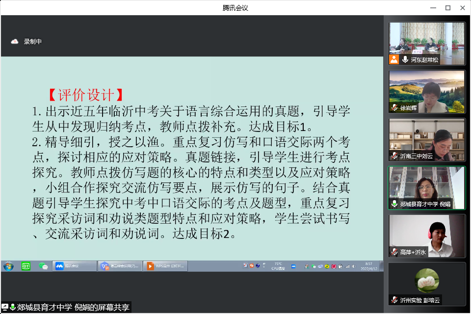 暖陽(yáng)花草香,紫燕攜春來(lái)。4月12日上午,臨沂沂州實(shí)驗(yàn)學(xué)校語(yǔ)文組的代表老師們?cè)谠贫斯蚕砹艘粓?chǎng)教學(xué)盛宴——臨沂市初中語(yǔ)文教學(xué)與評(píng)價(jià)線上研討會(huì)。我校初中教務(wù)處主任劉淼、語(yǔ)文教研組長(zhǎng)王慶玲、六至九年級(jí)語(yǔ)文備課組長(zhǎng)、優(yōu)秀教師代表陳奕明參加了此次會(huì)議。