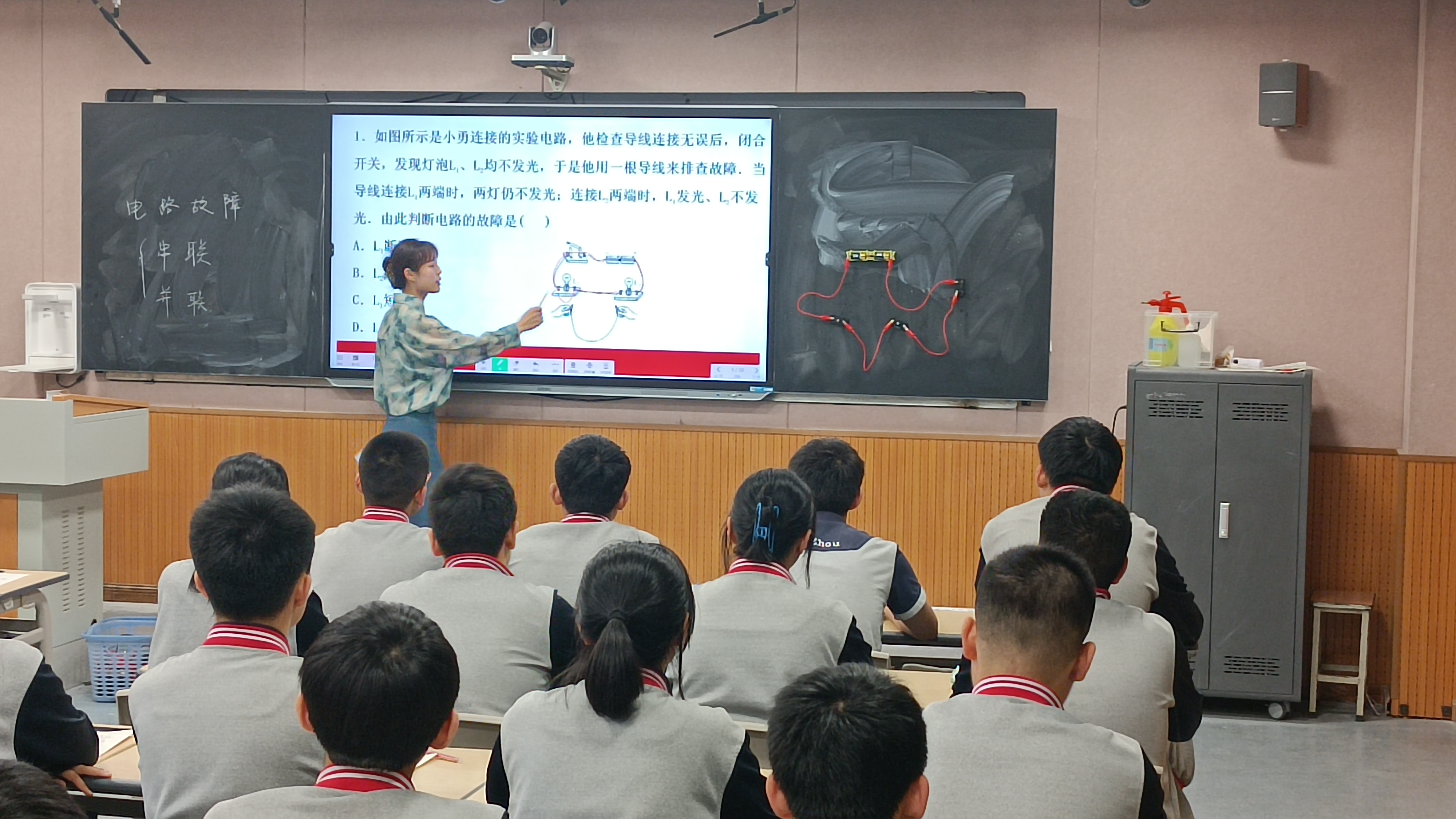 劉凡老師的專(zhuān)題課是《電路故障分析》,她以一個(gè)小游戲開(kāi)課,幫助學(xué)生回顧以往所學(xué)的關(guān)于電路故障的知識(shí)。然后引導(dǎo)學(xué)生去分析電路故障的原因以及故障所在的位置,再讓學(xué)生去分析講解。利用希沃白板的功能補(bǔ)全很多平時(shí)不太好完成的畫(huà)圖問(wèn)題,讓學(xué)生有個(gè)更清晰的認(rèn)識(shí)。