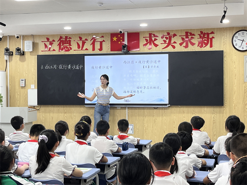 首先,由王昭妮老師執(zhí)教《植物媽媽有辦法》一課,王老師以森林之旅為情境,設(shè)計(jì)了詞語(yǔ)森林、植物樂園、翰墨秘島三個(gè)活動(dòng),幫助學(xué)生高效完成了學(xué)詞品句讀文任務(wù)。第二節(jié)課,由張金帆老師執(zhí)教《西江月·夜行黃沙道中》一課,張老師從正詩(shī)音、品詩(shī)畫、悟詩(shī)情三方面引領(lǐng)學(xué)生走進(jìn)辛棄疾的田園生活,感受他豐富的精神世界。