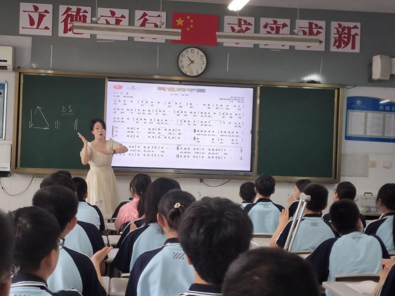 青年教師崔真瑜老師以三拍子節(jié)奏特點(diǎn)做導(dǎo)入,帶領(lǐng)學(xué)生感受三拍子強(qiáng)弱規(guī)律。隨后以優(yōu)美的圖片展示引出本節(jié)課歌曲——《彩色的中國(guó)》。圖片深深地吸引了學(xué)生的目光,崔老師問(wèn)“你覺(jué)得祖國(guó)有什么顏色?”同學(xué)們暢所欲言,課堂氛圍良好。學(xué)習(xí)歌曲時(shí),學(xué)生積極配合。他們聲情并茂,通過(guò)歌聲充分的表達(dá)出自己對(duì)祖國(guó)的熱烈愛(ài)意。