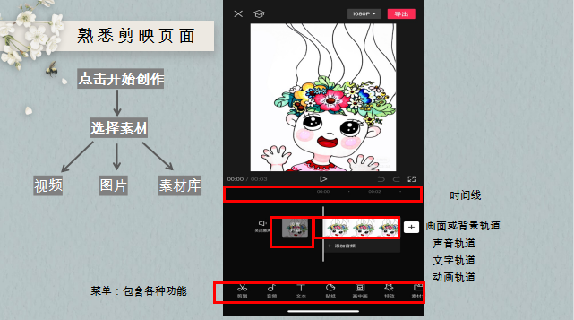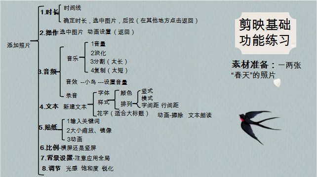 本次課程內(nèi)容實操性強,分為兩個階段,第一階段:通過PPT介紹剪映基本功能。