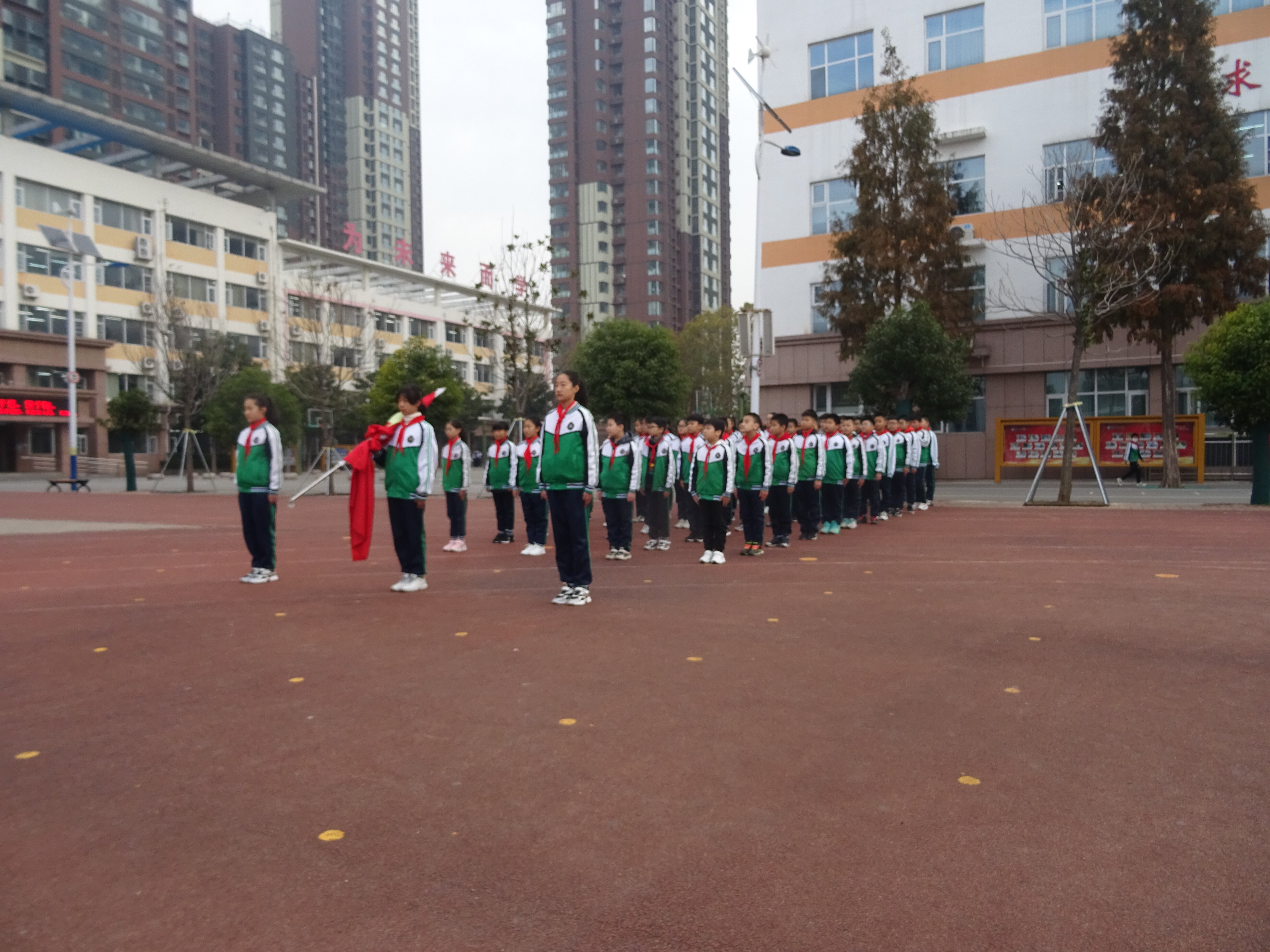 接著,升旗儀式正式開始,擔(dān)任本次升旗任務(wù)的是五、五中隊。隊員們邁著整齊的步伐,護送國旗入場。伴隨著激昂雄壯的國歌聲,鮮艷的五星紅旗冉冉升起,迎風(fēng)飄揚,全體師生肅立注目。