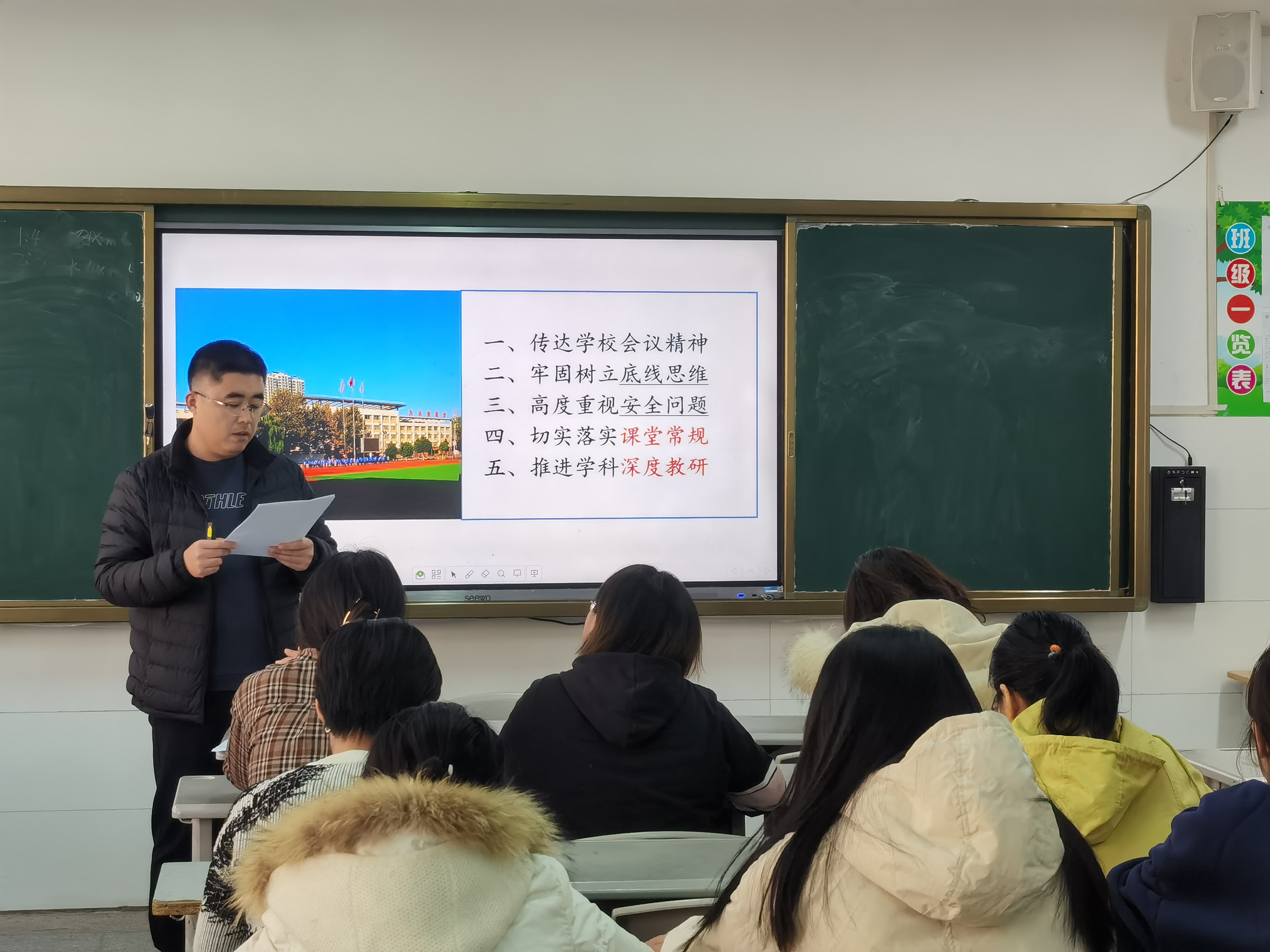 劉紀(jì)海老師首先傳達(dá)了學(xué)校職稱評(píng)審會(huì)議精神,強(qiáng)調(diào)教師需堅(jiān)決樹立底線思維:不體罰或變相體罰學(xué)生,不組織參與有償補(bǔ)課,不違規(guī)組織校外活動(dòng),不收取班費(fèi)以及訂購(gòu)校外輔導(dǎo)資料。隨后提醒教師需高度重視安全問題,并對(duì)冬季取暖問題以及校園欺凌問題進(jìn)行了詳細(xì)分析。