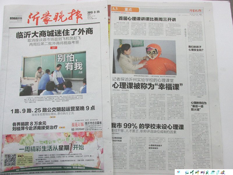 3月25日,沂蒙晚報(bào)頭版刊登了我校心理教育課堂建設(shè)圖片新聞,對(duì)我校心理課堂進(jìn)行了特別報(bào)道,并作了高度評(píng)價(jià),稱其為學(xué)生的“幸福課”。本月21日上午,徐勤波書記與沂蒙晚報(bào)記者一起在我校七年級(jí)七班聽了姜秀梅老師關(guān)于“信任”話題的心理課。記者隨堂對(duì)學(xué)生做了一些基本心理調(diào)查,學(xué)生表示非常喜歡學(xué)校開設(shè)的心理健康課程。姜老師還帶領(lǐng)記者參觀了學(xué)校的心理咨詢室,包括心理疏導(dǎo)辦公室及宣泄室,了解了心理教育在我校的開展情況。 (三學(xué)段宣傳組 彭培云)