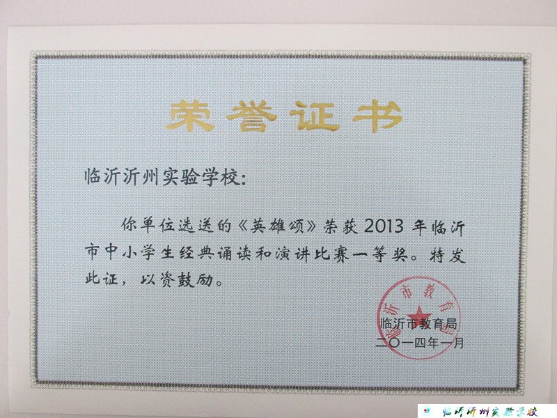 在臨沂市中小學(xué)經(jīng)典誦讀和演講比賽中,我校三學(xué)段組織參賽的《英雄頌》喜獲一等獎。