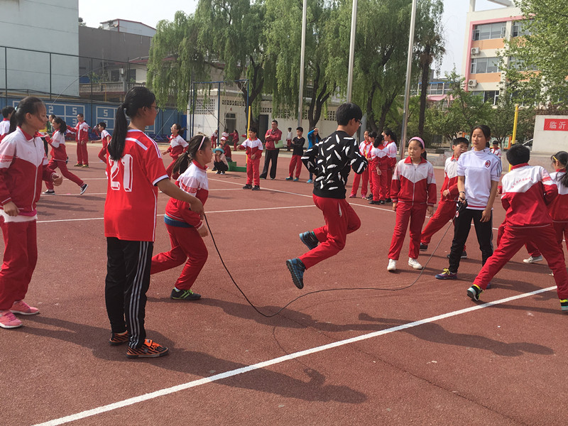 為了貫徹落實(shí)學(xué)校體育節(jié)活動(dòng)要求,4月18日下午,三學(xué)段六年級(jí)全體學(xué)生在操場(chǎng)進(jìn)行了跳大繩,踢毽子,跳繩等比賽項(xiàng)目。