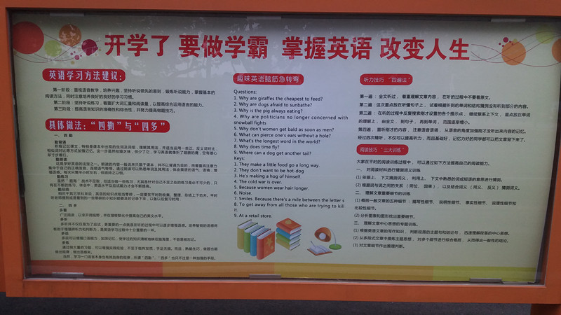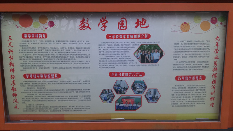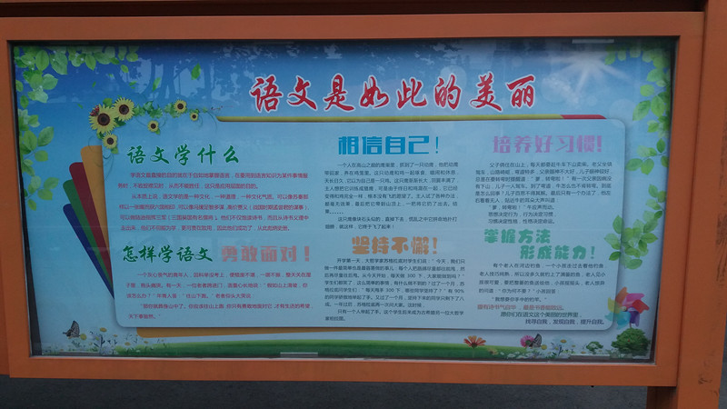 宣傳欄是校園文化建設(shè)的重要載體,是教育引導(dǎo)師生的重要輿論陣地,是展示學(xué)校良好形象的重要窗口。三學(xué)段一向注重利用宣傳欄進(jìn)行教育教學(xué)的滲透,在開學(xué)伊始就要求各教研組本著高度負(fù)責(zé)的精神,按時(shí)完成宣傳欄內(nèi)容更換工作。各學(xué)科教研組在宣傳板塊中彰顯學(xué)科特點(diǎn),細(xì)節(jié)內(nèi)容絕不雷同,布置形式也都做到了圖文并茂,突出特色,有所創(chuàng)新。語文組的主題是《語文是如此的美麗》,告訴學(xué)生們語文學(xué)什么,怎么學(xué)。數(shù)學(xué)組的主題是《數(shù)學(xué)園地》,著重介紹了數(shù)學(xué)學(xué)科特點(diǎn)和小組合作學(xué)習(xí)在數(shù)學(xué)課堂上的運(yùn)用。英語組的主題是《開學(xué)了,要做學(xué)霸,掌握英語,改變?nèi)松罚瑢W(xué)生提出了英語學(xué)習(xí)的建議,并指明了具體做法。其他學(xué)科組也分別展示了自身特色和學(xué)習(xí)要領(lǐng)。三學(xué)段宣傳欄進(jìn)一步豐富了校園文化生活,增強(qiáng)了校園文化氛圍,優(yōu)化了育人環(huán)境。(沈玉興)