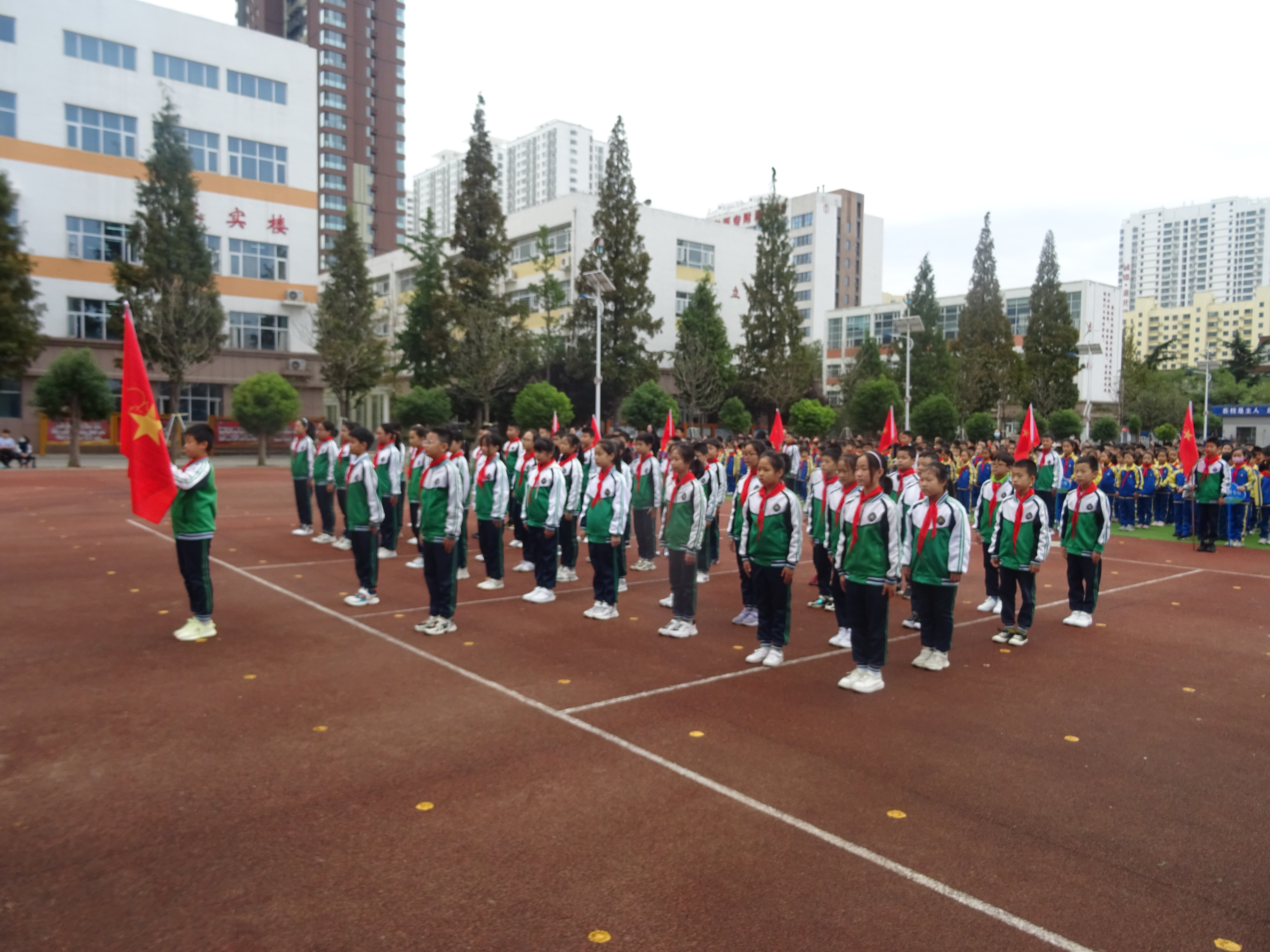 伴隨著莊嚴(yán)的出旗曲,鮮艷的大隊(duì)旗和中隊(duì)旗迎風(fēng)飄揚(yáng)。新少先隊(duì)員們用標(biāo)準(zhǔn)的隊(duì)禮,向隊(duì)旗致敬!