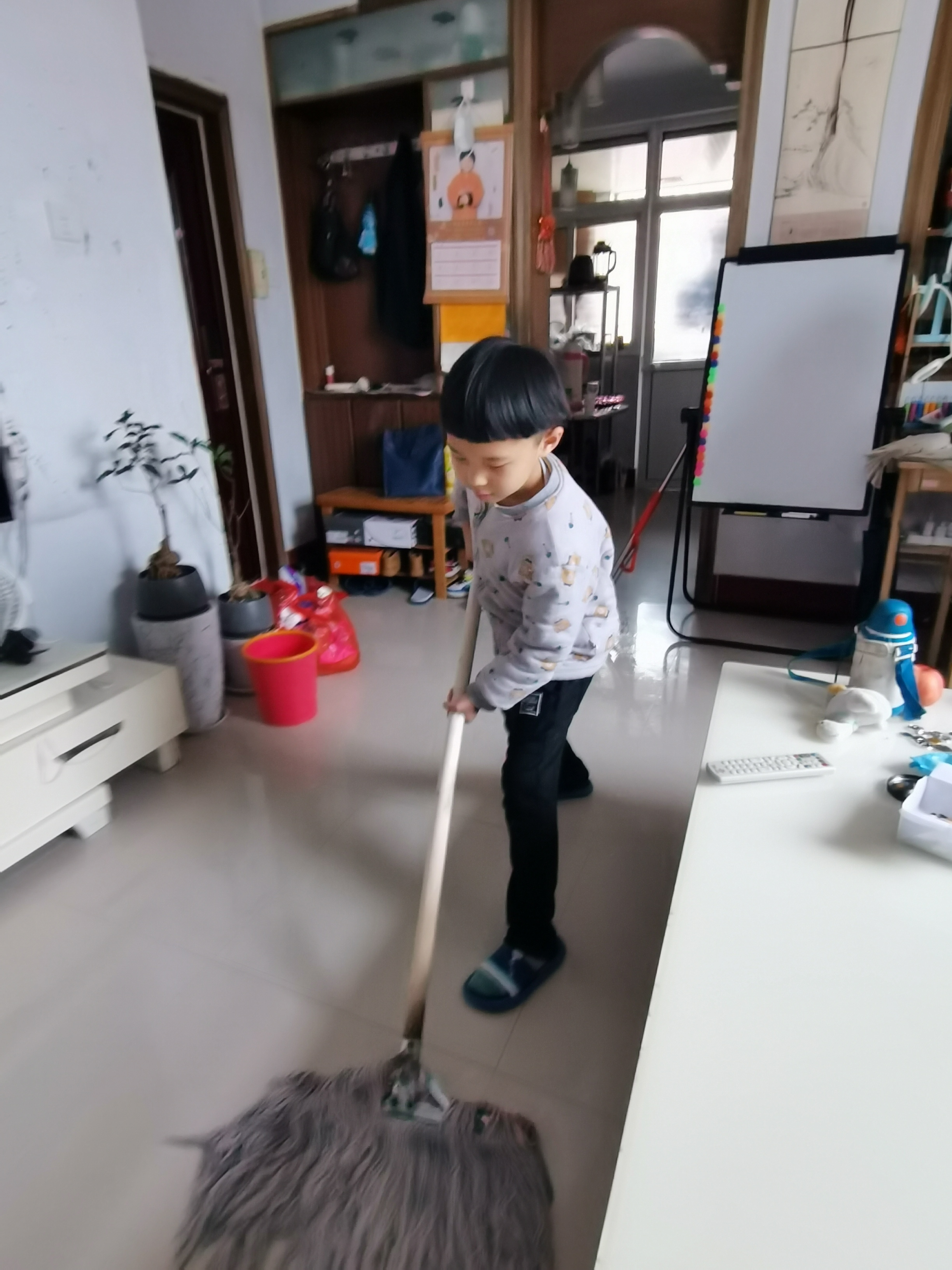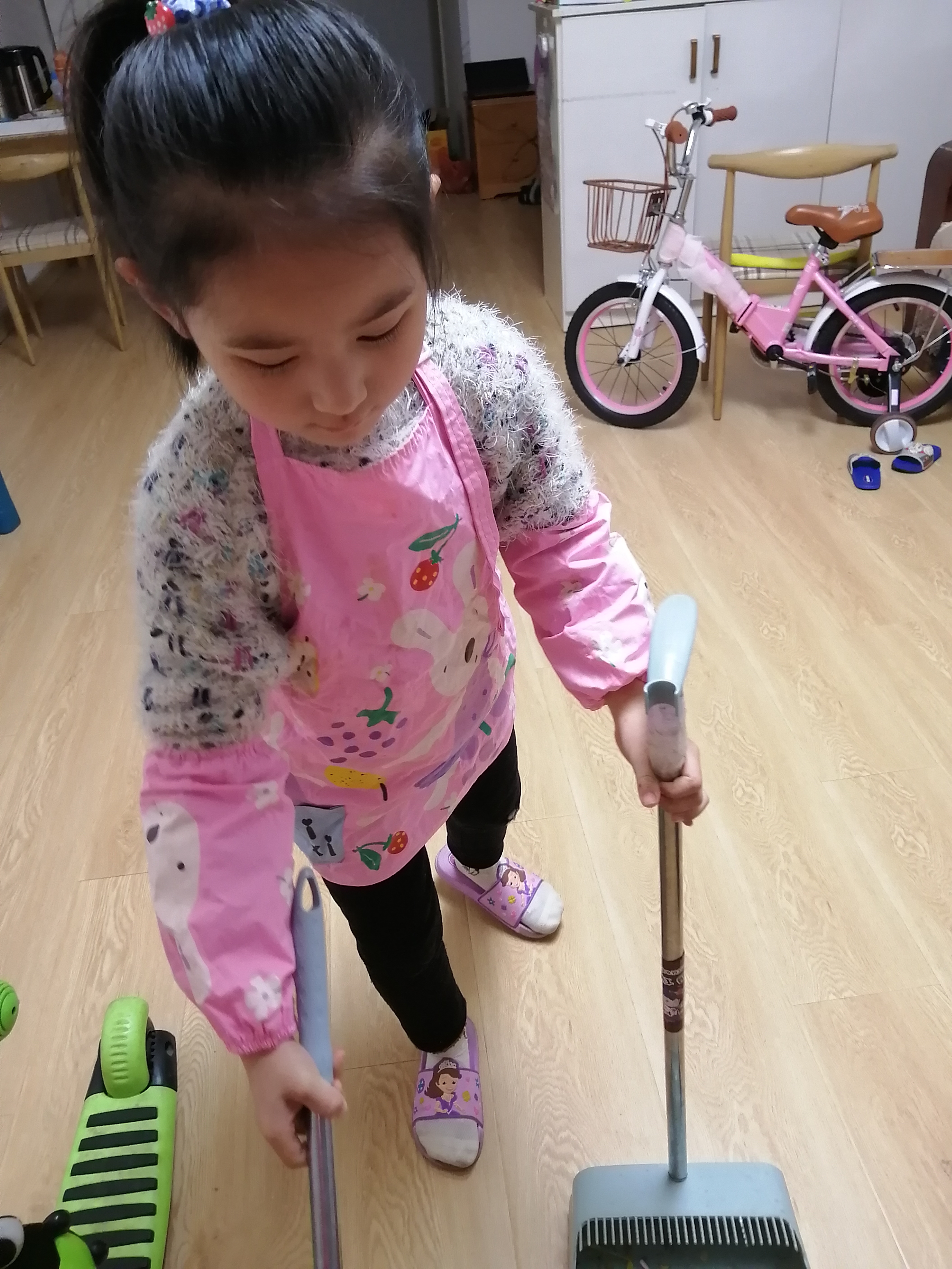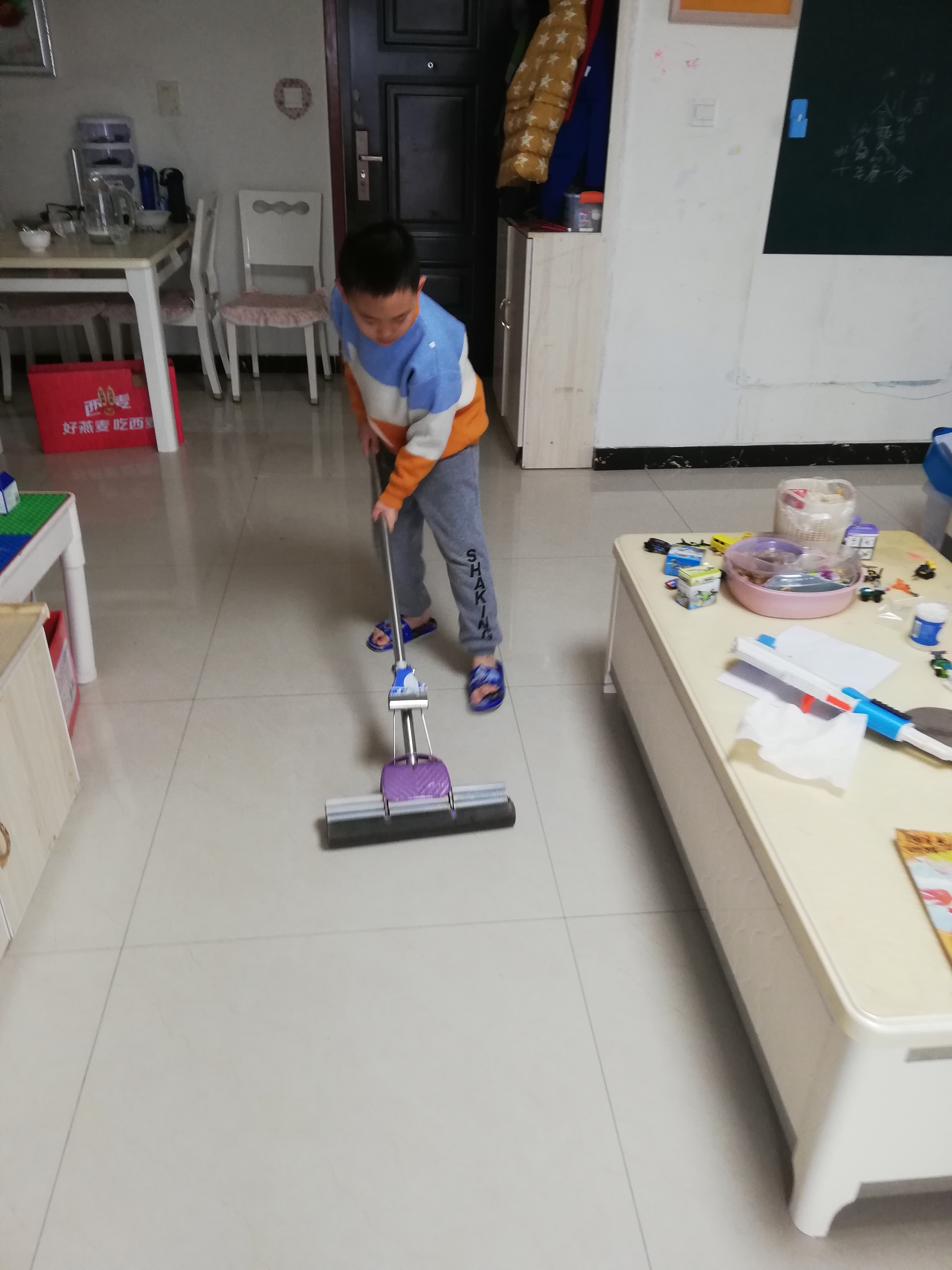 孩子們選取了自己適合的打掃項(xiàng)目,拿著抹布、掃把、拖把,在爸爸媽媽的指導(dǎo)下掃地、擦桌子、擦椅子、整理書(shū)柜、整理玩具等等,孩子們認(rèn)認(rèn)真真打掃自己的家,創(chuàng)造著自己的美麗家園。