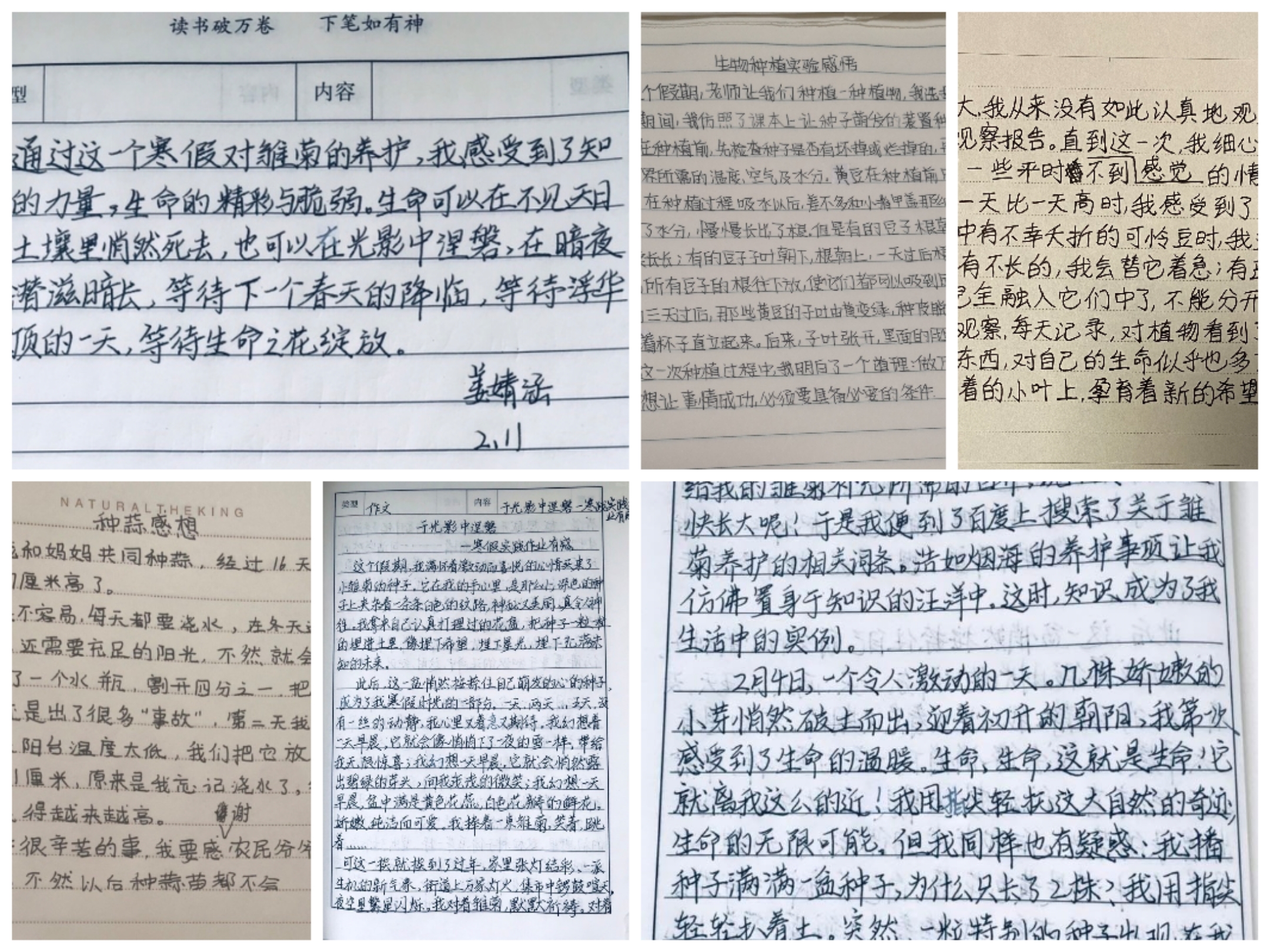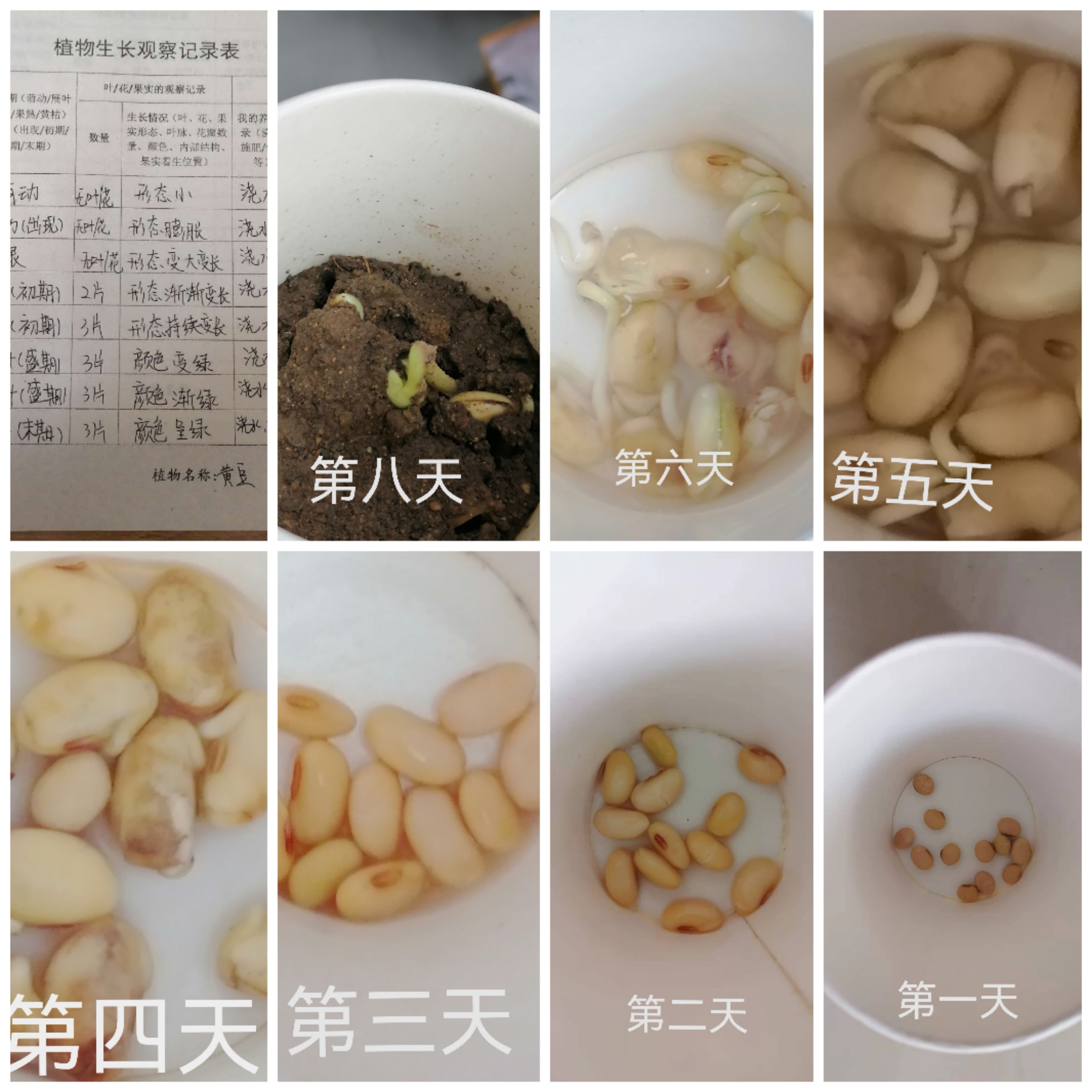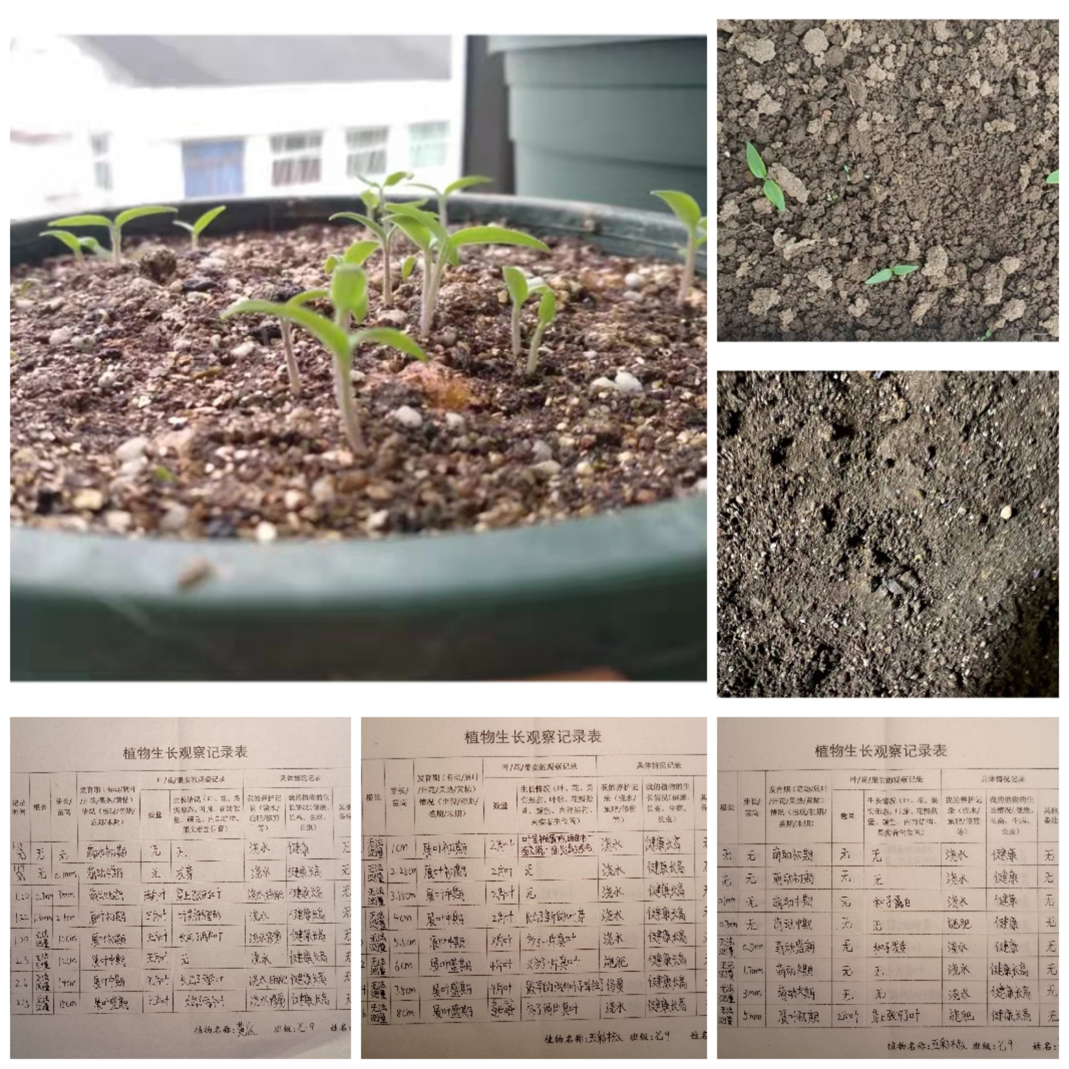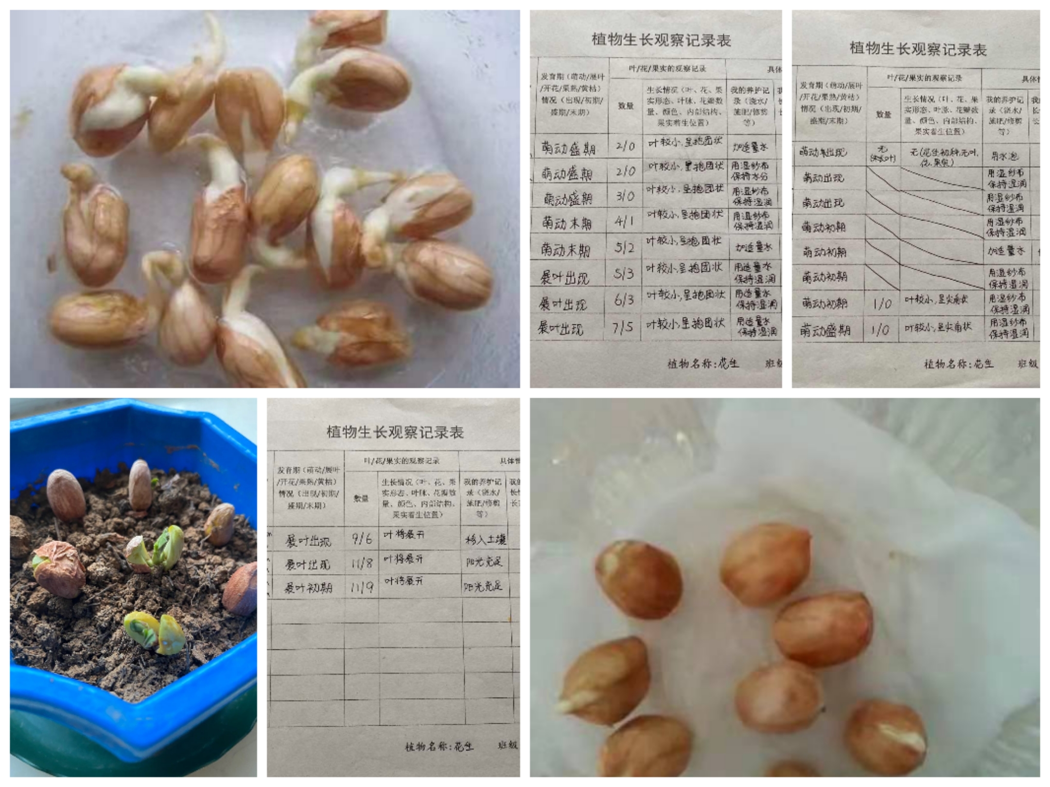 同學(xué)們自選植物,花生,大豆,小雛菊,豌豆,土豆等等,都成為了非常好的實驗材料。通過選材來培養(yǎng)學(xué)生們的認知能力,能夠認識生活中常見的植物種子,同學(xué)們來自己制定計劃,觀察并記錄種子的萌發(fā)、植株的生長,有的還觀察到了開花的過程。這種走出課堂,寓教于樂的教育活動方式,極大激發(fā)了同學(xué)們的學(xué)習(xí)熱情。現(xiàn)在讓我們一起來看看他們生物研究性學(xué)習(xí)成果吧!