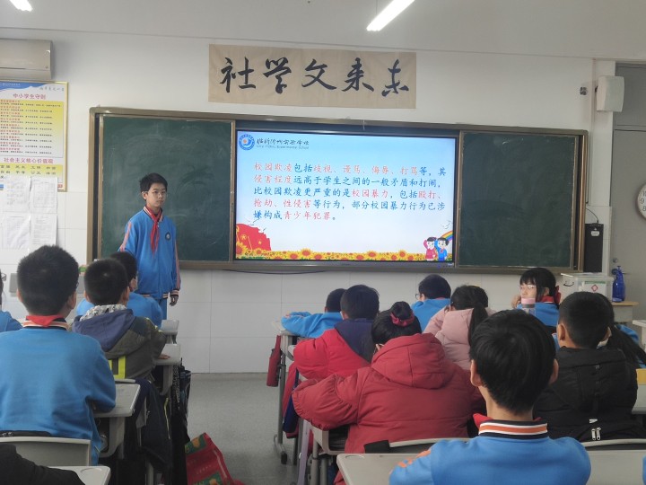 “一日之計在于晨”,劉紀(jì)海老師從一天中寶貴的開端談起,耐心解說六年級一日常規(guī):從讀書規(guī)范到課堂參與,從課間秩序到跑操事項,從放學(xué)路線到自習(xí)紀(jì)律,內(nèi)容切實可行,條目詳細(xì)清晰,呼吁學(xué)生應(yīng)處處留心,事事盡心,為步入初中做好準(zhǔn)備。同時,樹立“我為人人 ,人人為我”觀念,從日常衛(wèi)生著手,為集體事務(wù)考慮。在同學(xué)關(guān)系相處方面,劉紀(jì)海老師系統(tǒng)解說校園欺凌現(xiàn)象以及應(yīng)對措施,倡導(dǎo)學(xué)生面對欺凌現(xiàn)象應(yīng)敢于報告,機(jī)智應(yīng)對,冷靜處理,用實際行動維護(hù)安全、快樂的校園環(huán)境。