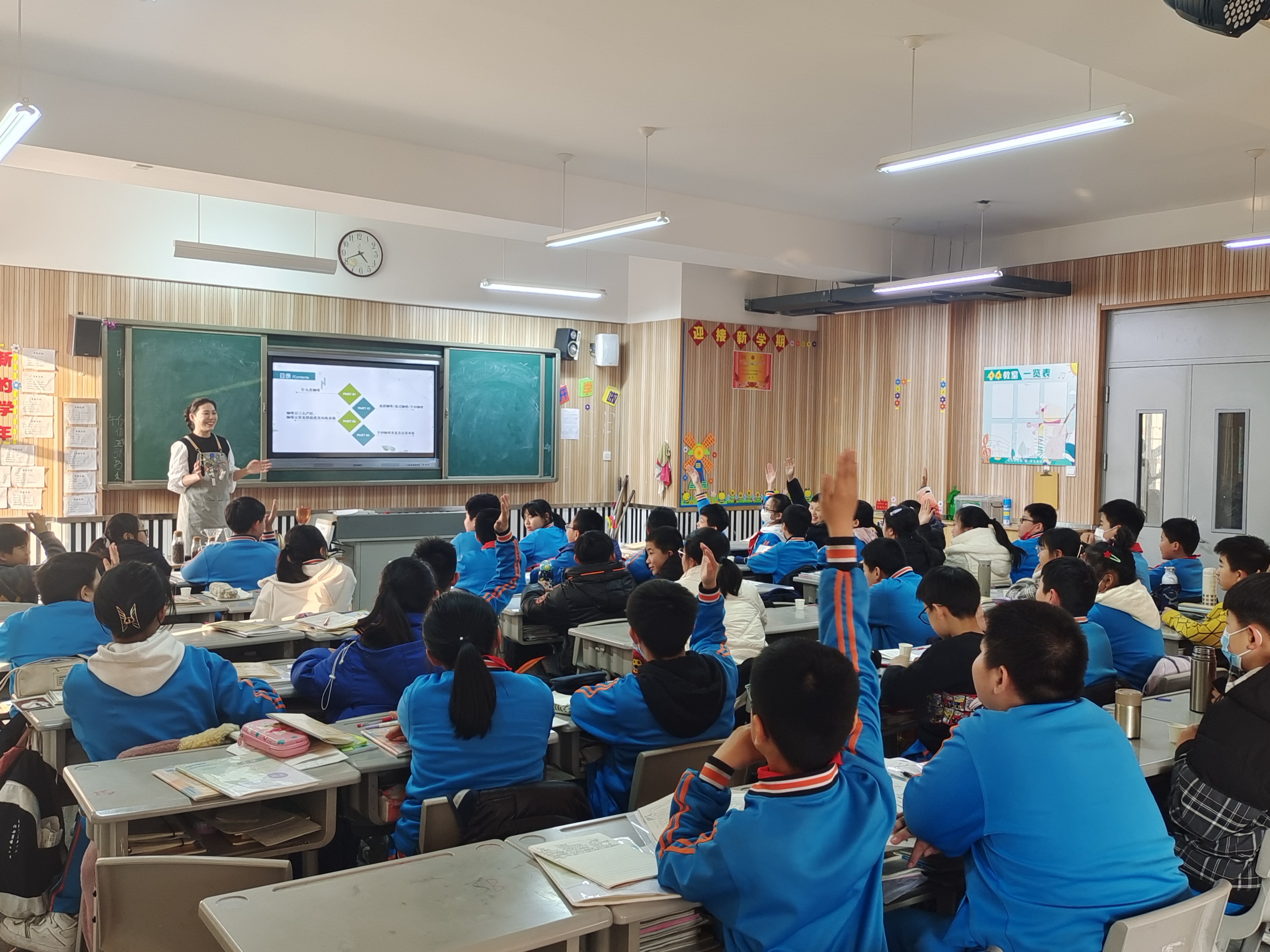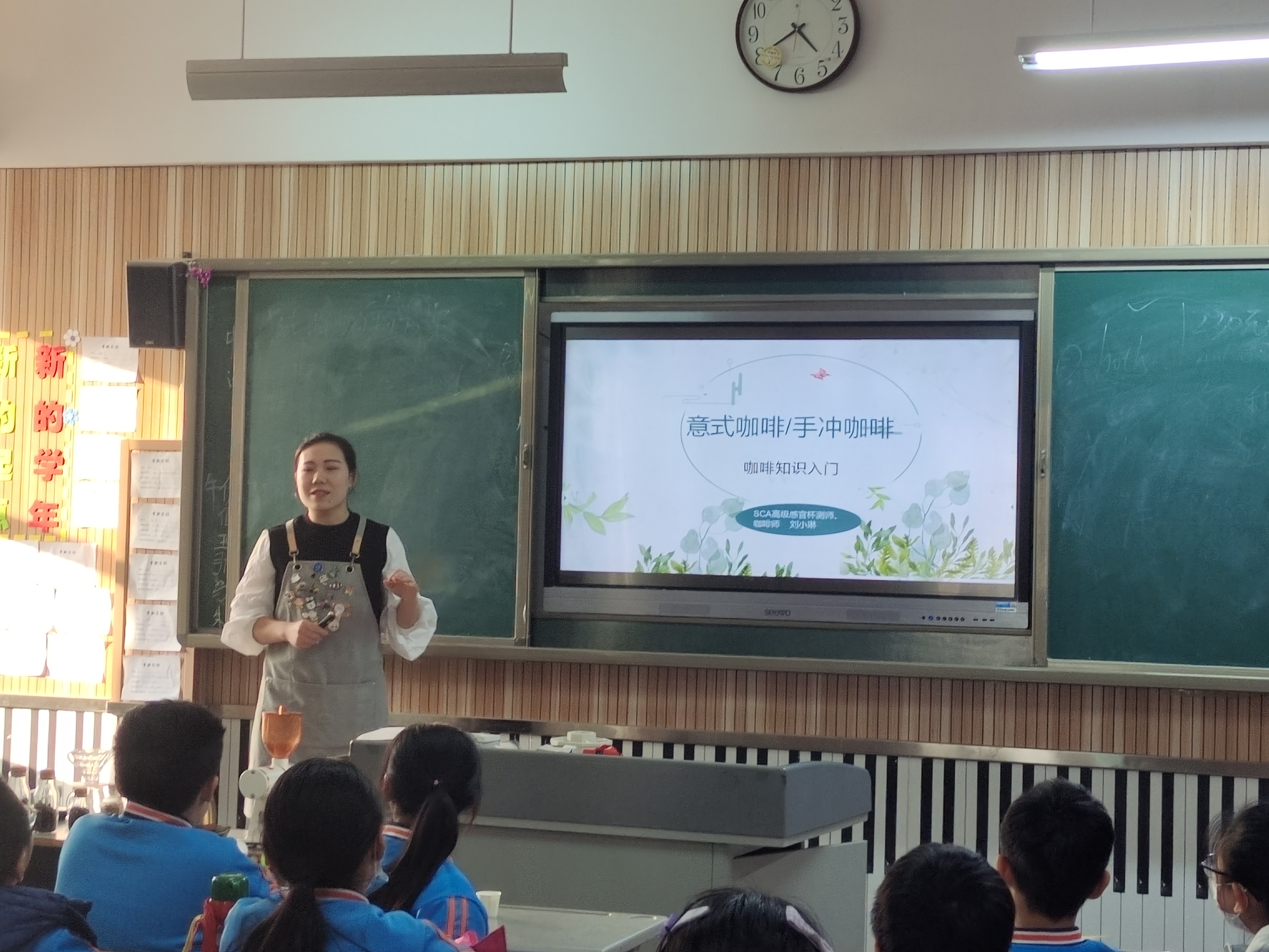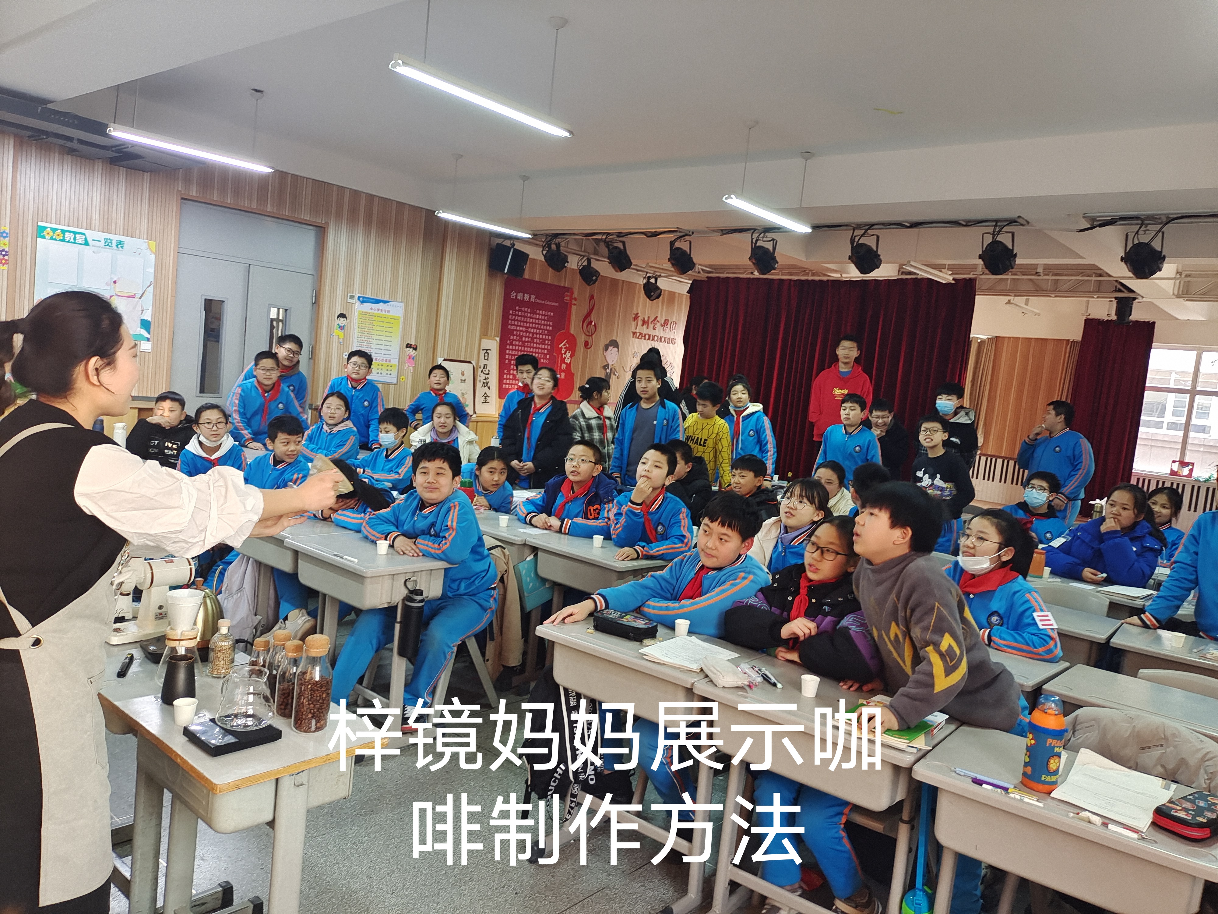 梓境媽媽首先介紹了“什么是咖啡”,通過展示咖啡果的生長與結(jié)構(gòu)向大家普及了生物學(xué)知識;接著,她為大家介紹了咖啡豆的三大產(chǎn)區(qū),通過講解咖啡豆生長的地理位置、氣候環(huán)境,以及為什么能產(chǎn)出優(yōu)質(zhì)咖啡從而引起同學(xué)們對學(xué)習(xí)地理的興趣;她還分析了咖啡豆的營養(yǎng)成分和風(fēng)味分子,鼓勵大家好好學(xué)習(xí)化學(xué),為將來深入研究打好基礎(chǔ);在介紹“手沖咖啡”要素時,梓境媽媽還即興出了幾道數(shù)學(xué)題,請同學(xué)們幫忙算出在不同配比下所需咖啡和水的質(zhì)量,體現(xiàn)了數(shù)學(xué)在日常生活中的重要性。她笑稱,“學(xué)好數(shù)理化,走遍天下都不怕”,鼓勵大家好好學(xué)習(xí),長大成為能為國家做出突出貢獻(xiàn)的棟梁之才。同學(xué)們紛紛表示,沒想到小小的咖啡中竟然隱藏這么多的知識!