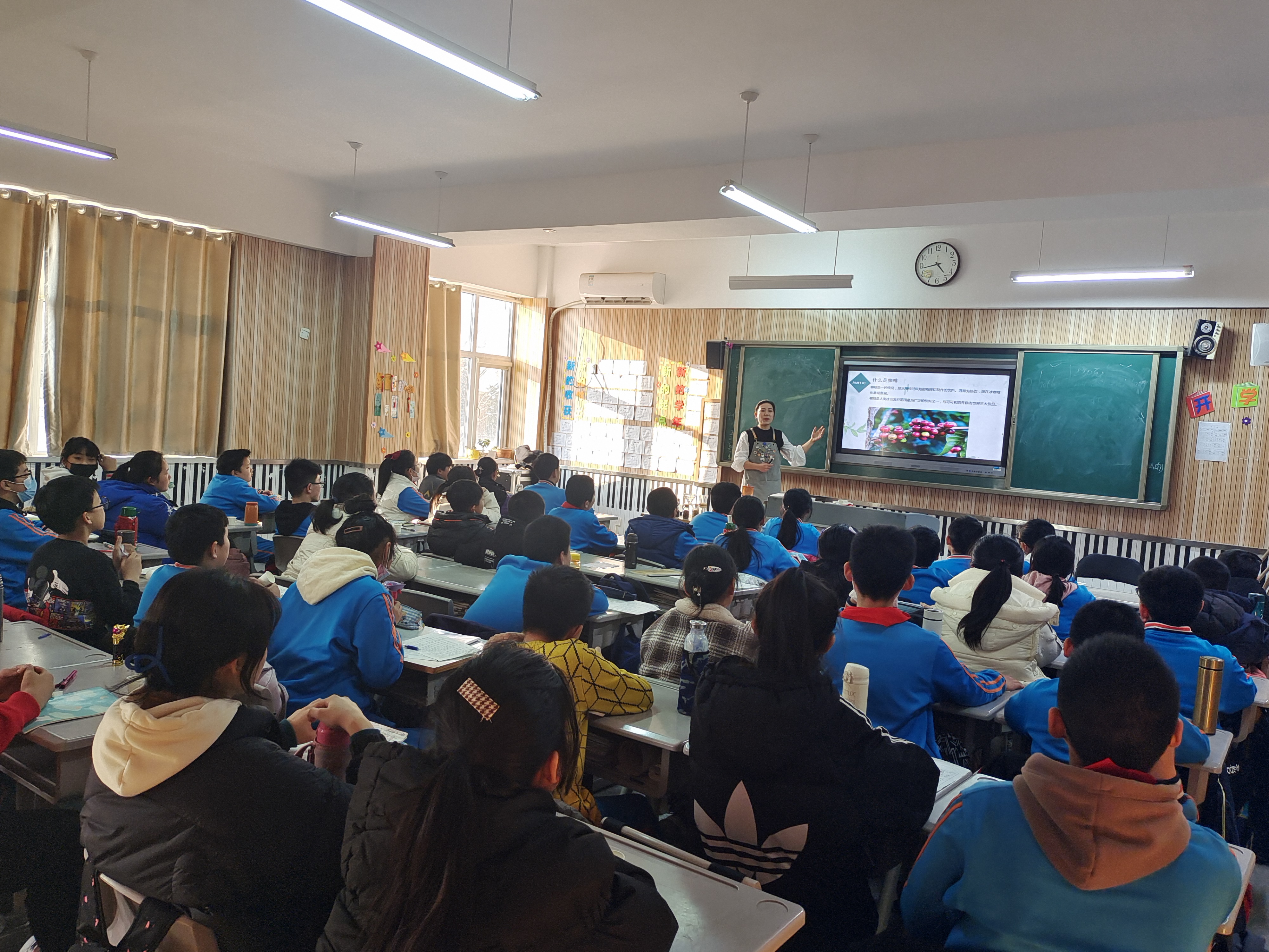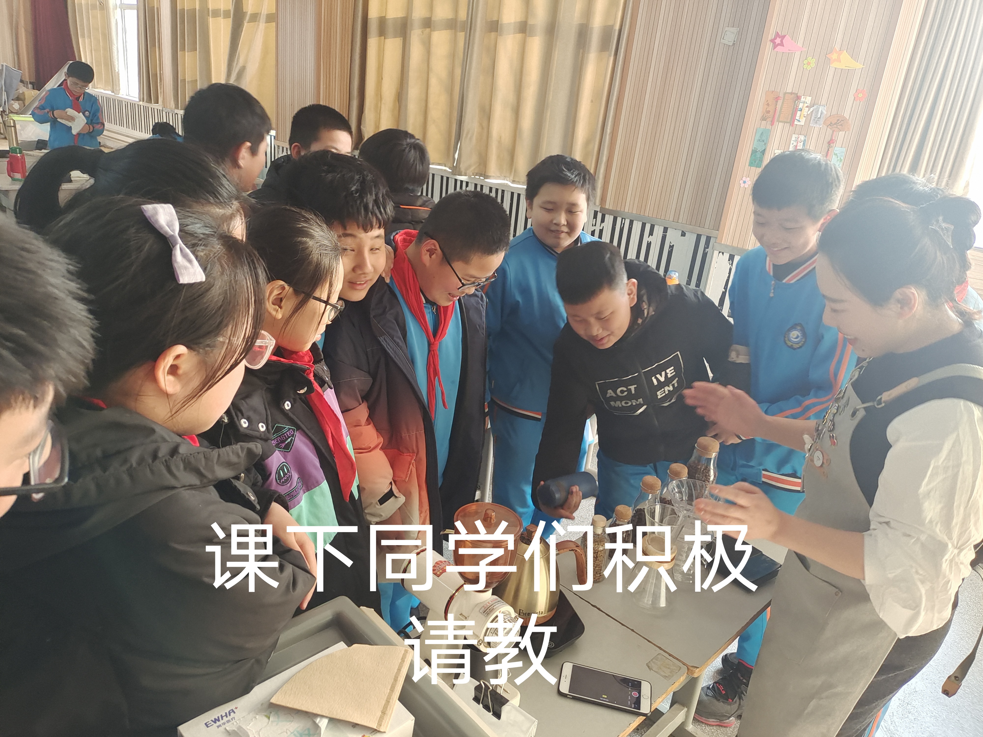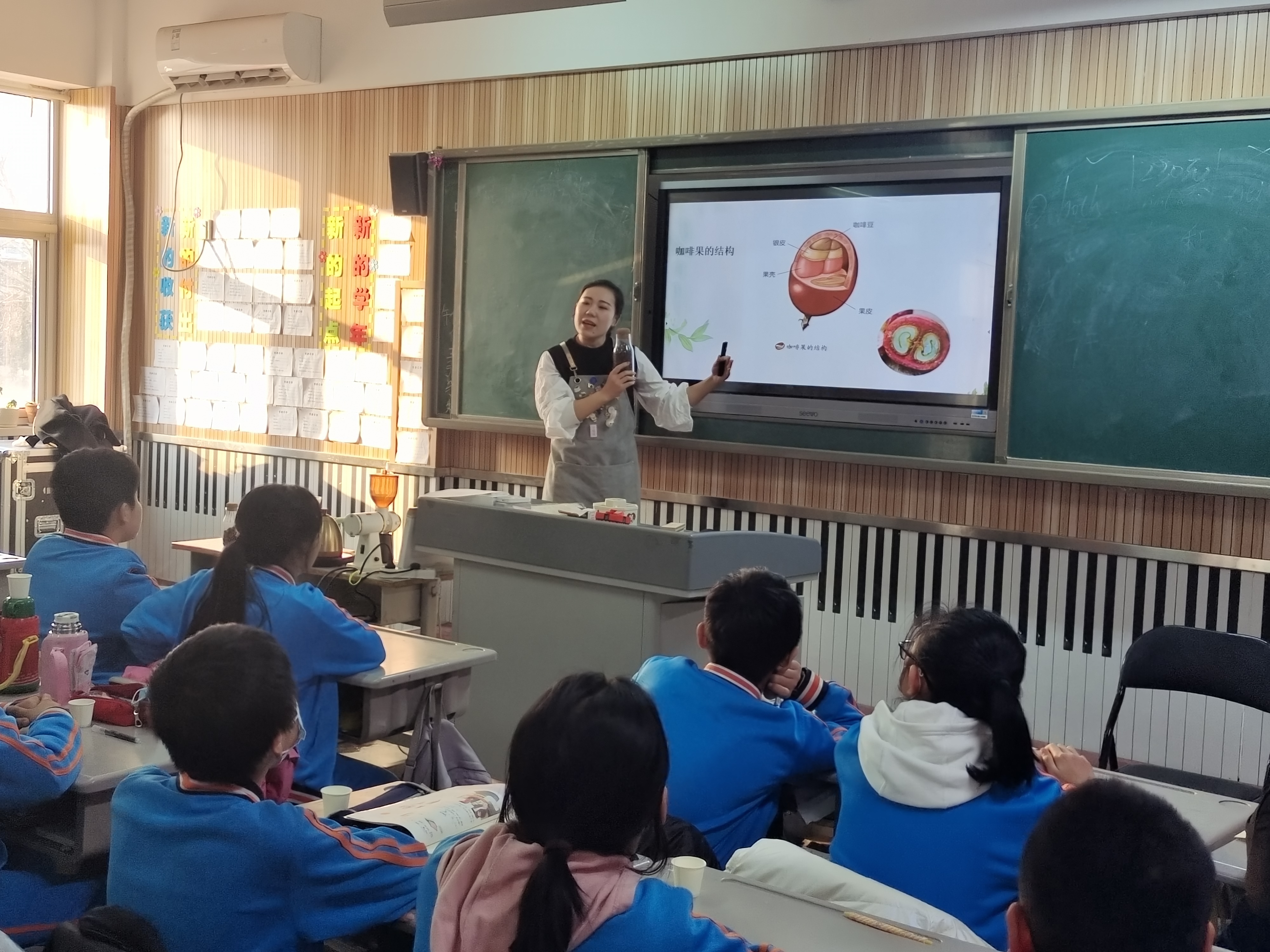 梓境媽媽首先介紹了“什么是咖啡”,通過展示咖啡果的生長與結(jié)構(gòu)向大家普及了生物學(xué)知識;接著,她為大家介紹了咖啡豆的三大產(chǎn)區(qū),通過講解咖啡豆生長的地理位置、氣候環(huán)境,以及為什么能產(chǎn)出優(yōu)質(zhì)咖啡從而引起同學(xué)們對學(xué)習(xí)地理的興趣;她還分析了咖啡豆的營養(yǎng)成分和風(fēng)味分子,鼓勵大家好好學(xué)習(xí)化學(xué),為將來深入研究打好基礎(chǔ);在介紹“手沖咖啡”要素時,梓境媽媽還即興出了幾道數(shù)學(xué)題,請同學(xué)們幫忙算出在不同配比下所需咖啡和水的質(zhì)量,體現(xiàn)了數(shù)學(xué)在日常生活中的重要性。她笑稱,“學(xué)好數(shù)理化,走遍天下都不怕”,鼓勵大家好好學(xué)習(xí),長大成為能為國家做出突出貢獻(xiàn)的棟梁之才。同學(xué)們紛紛表示,沒想到小小的咖啡中竟然隱藏這么多的知識!