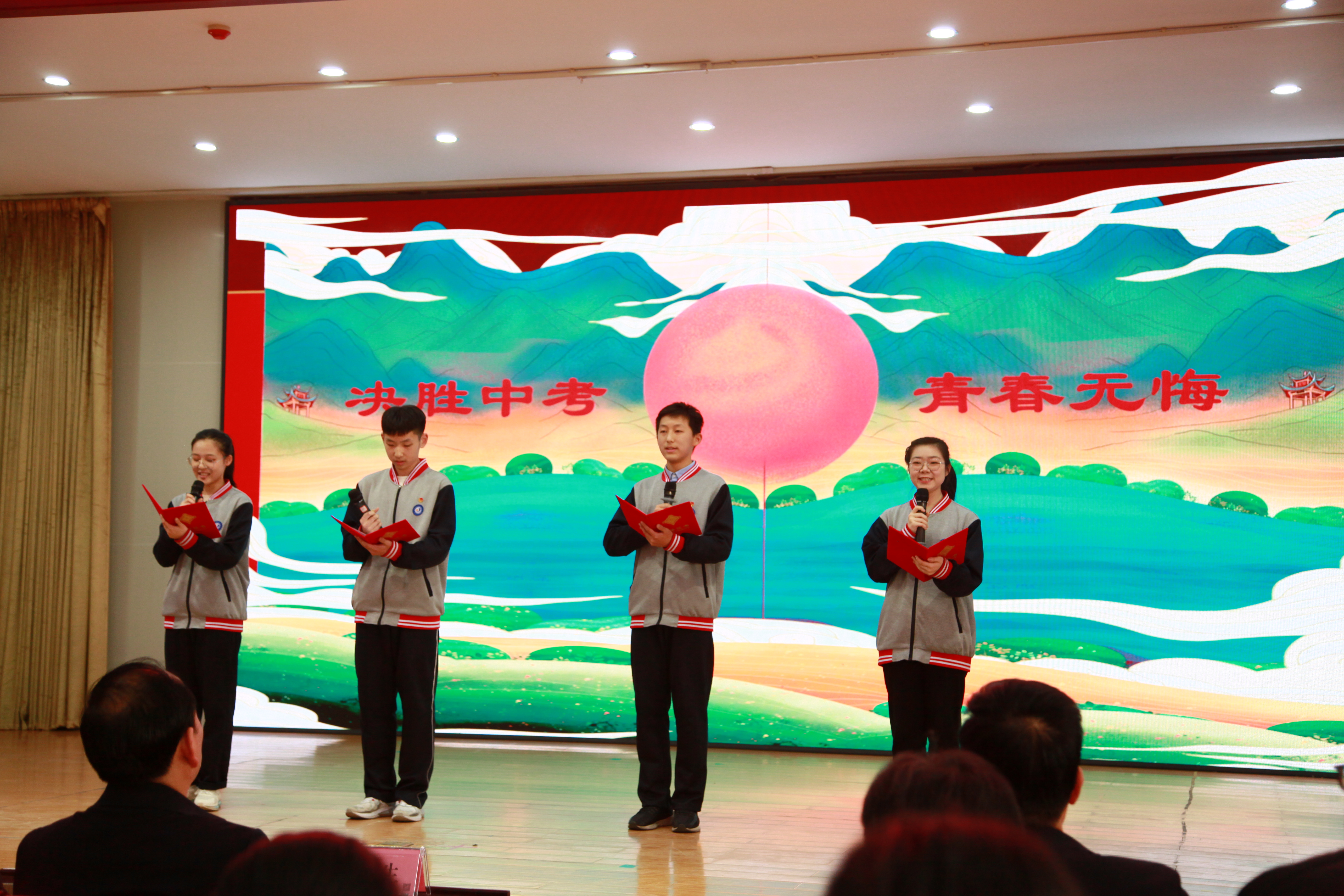 接著,九年級教師代表和學(xué)生代表分別帶來了詩朗誦,教師們激情滿懷,為學(xué)子們助威吶喊,承諾必將用辛勤和汗水為最后的沖刺保駕護(hù)航;學(xué)子們將堅持奮戰(zhàn)百天,喚醒所有潛能,拼盡全力,守護(hù)心中愿景。最后,九年級學(xué)子集體宣誓,以整齊、洪亮的聲音,發(fā)出決勝中考的挑戰(zhàn)。會議場上鏗鏘的誓言,燃燒著青春的理想,激蕩著拼搏的決心,使人熱血沸騰,感染著每一位師生。