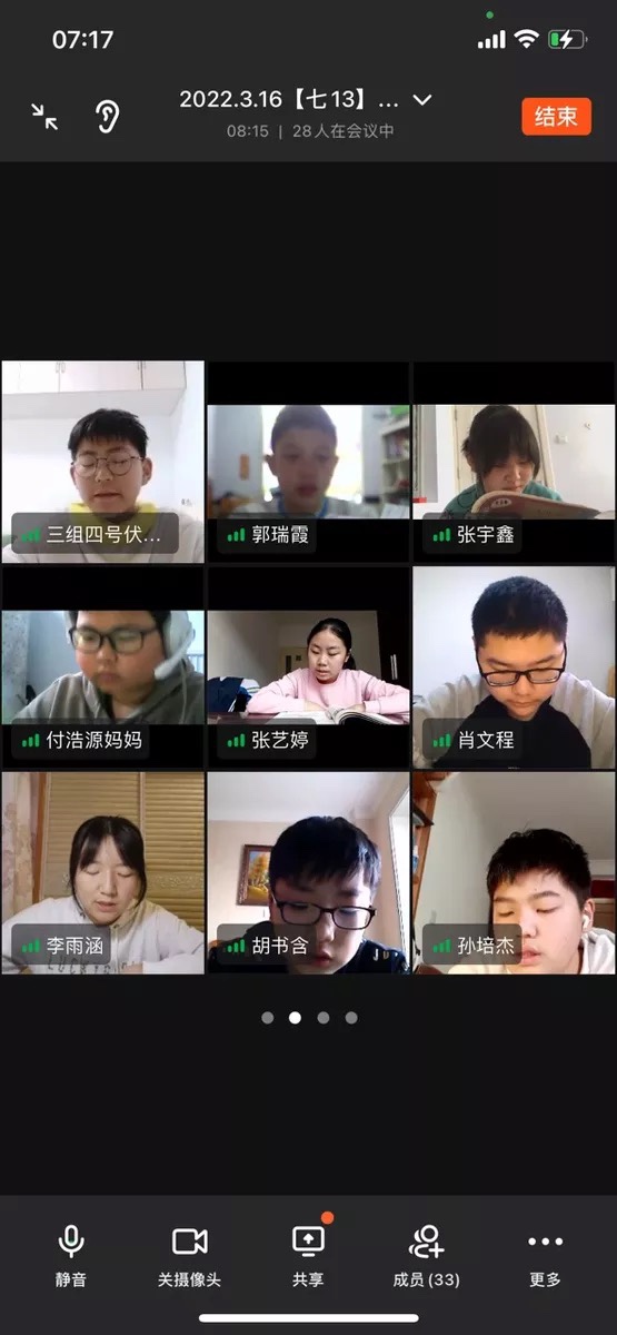 16日早上,伴隨著春日溫暖的陽光,七年級的班主任們通過視頻會議來看學(xué)生們進(jìn)行早讀了。每天的早讀讀的是不一樣的學(xué)科,這個由年級統(tǒng)一規(guī)劃協(xié)調(diào),確定好后,各學(xué)科制定早讀計劃,于前一天晚上發(fā)布到各個班級,第二天一早學(xué)生們就可以根據(jù)早讀的計劃,快速高效完成。讀書的環(huán)境變了,但是學(xué)生們瑯瑯的讀書聲和專注的神情卻沒有變。