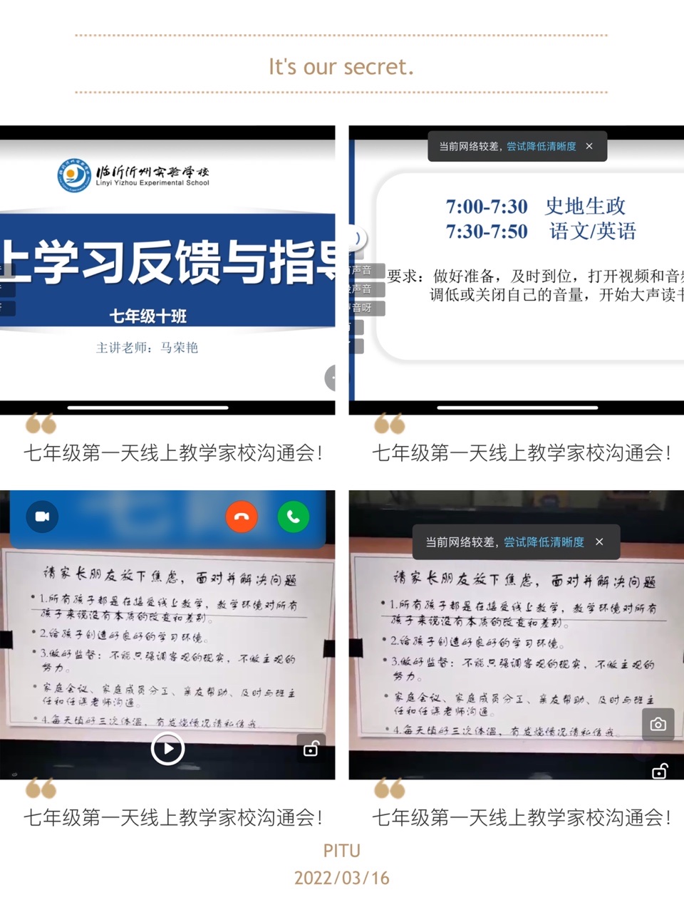 一天的線上教學(xué)結(jié)束后,學(xué)生們表示收獲滿滿。而老師們并未進(jìn)行休息,七年級迅速再次召開了全體教師會。會上,上課教師對授課的情況進(jìn)行反饋,包括設(shè)備調(diào)試、上課紀(jì)律、學(xué)生學(xué)習(xí)效果等方面,好的經(jīng)驗(yàn)以供其他上課教師學(xué)習(xí),出現(xiàn)問題則一起探討解決辦法,力求達(dá)到最好的效果,保證線上教學(xué)的質(zhì)量。
