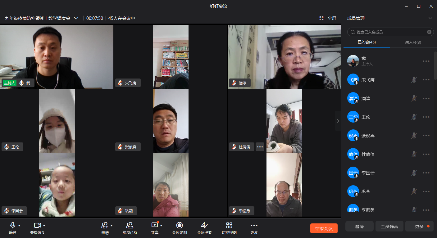 在中學(xué)教務(wù)處統(tǒng)籌下,九年級(jí)首先組織備課組長會(huì)議,由王曉峰主任帶領(lǐng)備課組長結(jié)合各自學(xué)科特點(diǎn),制定了詳細(xì)的教學(xué)方案,之后召開全體教師會(huì),向全體老師傳達(dá)了上級(jí)文件精神,明確授課方式、教師職責(zé)及教學(xué)規(guī)范,并安排專人指導(dǎo)老師線上教學(xué)流程,各備課組認(rèn)真教研,充分做好上課準(zhǔn)備。