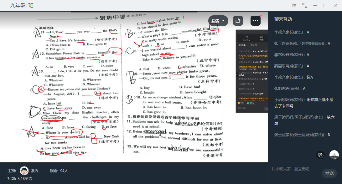 15日晚,徐彪副主任為9年級(jí)全體家長和學(xué)生召開線上學(xué)習(xí)指導(dǎo)會(huì),傳達(dá)了上級(jí)防疫要求,部署線上教學(xué)安排,明確家長職責(zé)和學(xué)生要求,并對(duì)家長和學(xué)生進(jìn)行指導(dǎo),打消家長顧慮,堅(jiān)定學(xué)生信念,鼓舞全體家長和同學(xué)為奮戰(zhàn)中考不放松不偷懶,全力沖刺,把線上教學(xué)從挑戰(zhàn)轉(zhuǎn)變?yōu)橐淮螌?shí)現(xiàn)超越的機(jī)遇。