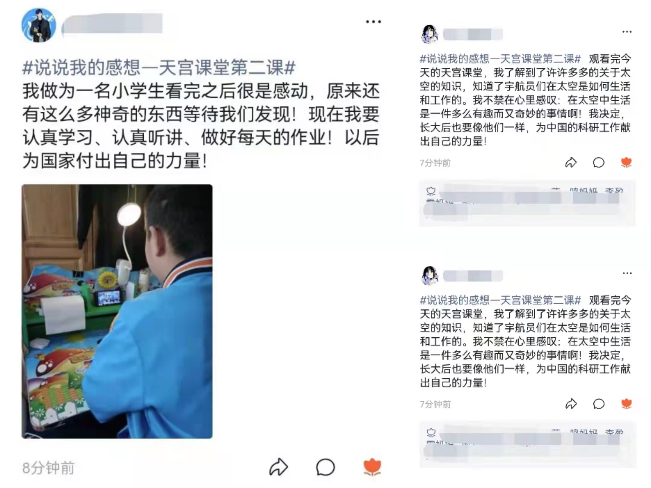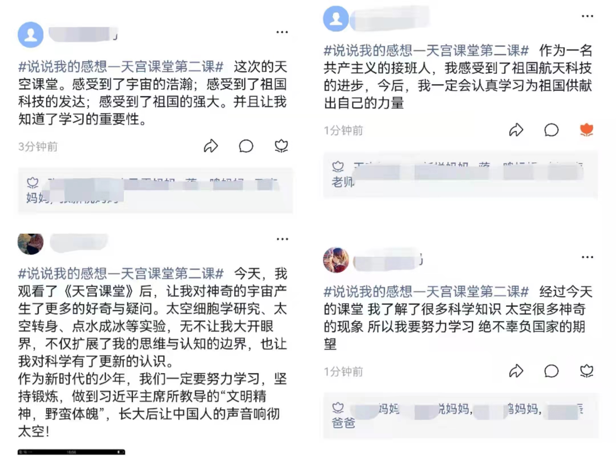 在“水油分離”、“冰墩墩空翻”等實驗中,王亞平和葉光富兩位老師將牛頓第一定律中描述的現(xiàn)象生動地呈獻給學生,此時孩子們的目光中透露出更多的求知欲望。而隨后的鏡頭,更是讓學生們心馳神往,原來科學家們利用太空的高微重力制作了實驗室,并配備了各種實驗器材:高微重力實驗柜、懸浮試驗臺、無容器實驗柜,種種奇妙的物理原理與巧妙的科學設(shè)計讓師生驚奇、佩服又向往,帶著這份期待,學生們紛紛在班級圈內(nèi)發(fā)出了自己的感慨,