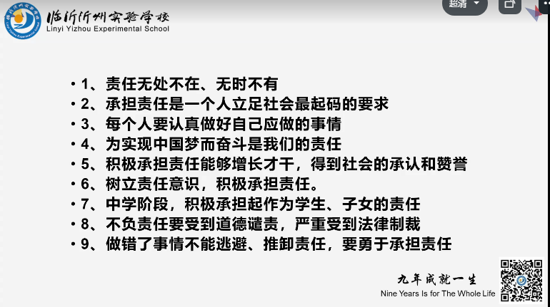 “天下興亡,匹夫有責(zé)?!必?zé)任心是對自身肩負(fù)使命所具備的忠誠和信念,更是每個人都應(yīng)具備的基本素質(zhì)。培養(yǎng)學(xué)生的責(zé)任感對于青少年養(yǎng)成良好的品德、形成健全的人格有著重要的意義。為此,七年級于3月30日下午通過釘釘直播的形式召開了“成長與責(zé)任”德育主題班會,本次班會由韓淑霞主任主講。