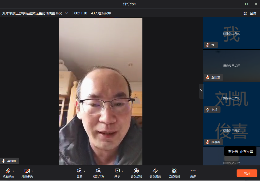 會(huì)議第一階段,九年級(jí)5位備課組長進(jìn)行線上教學(xué)經(jīng)驗(yàn)交流,展示本學(xué)科組的優(yōu)秀做法。王慶玲老師重點(diǎn)分享了語文在強(qiáng)化課堂及作文訓(xùn)練中所做的努力,堅(jiān)決落實(shí)“當(dāng)堂背誦——當(dāng)堂反饋——再強(qiáng)化”模式,筑牢根基,針對(duì)分值最重的作文,語文老師們結(jié)合熱點(diǎn)自主命題,對(duì)學(xué)生作文進(jìn)行反復(fù)批改和打磨;王海英老師介紹了數(shù)學(xué)組在備題、備課堂、備作業(yè)等方面,做好充分的集體教研和課前準(zhǔn)備,為同學(xué)們打造高效率、高質(zhì)量的數(shù)學(xué)課堂;張潔老師對(duì)英語組每位老師的優(yōu)秀做法進(jìn)行了總結(jié),在抓牢基礎(chǔ)知識(shí)方面,每位老師都展現(xiàn)出獨(dú)特的教學(xué)魅力,體現(xiàn)了組內(nèi)相互學(xué)習(xí)、相互借鑒的良好教學(xué)聯(lián)動(dòng)狀態(tài);李振勇老師展示了物理組對(duì)于“釘釘”這一教學(xué)平臺(tái)的深入研究和充分利用,注重發(fā)掘線上教學(xué)的優(yōu)點(diǎn),有效推動(dòng)物理教學(xué);邵海紅老師圍繞典型例題練習(xí)與分析合理分配課堂時(shí)間,充分展示了化學(xué)老師豐富的中考指導(dǎo)經(jīng)驗(yàn)。