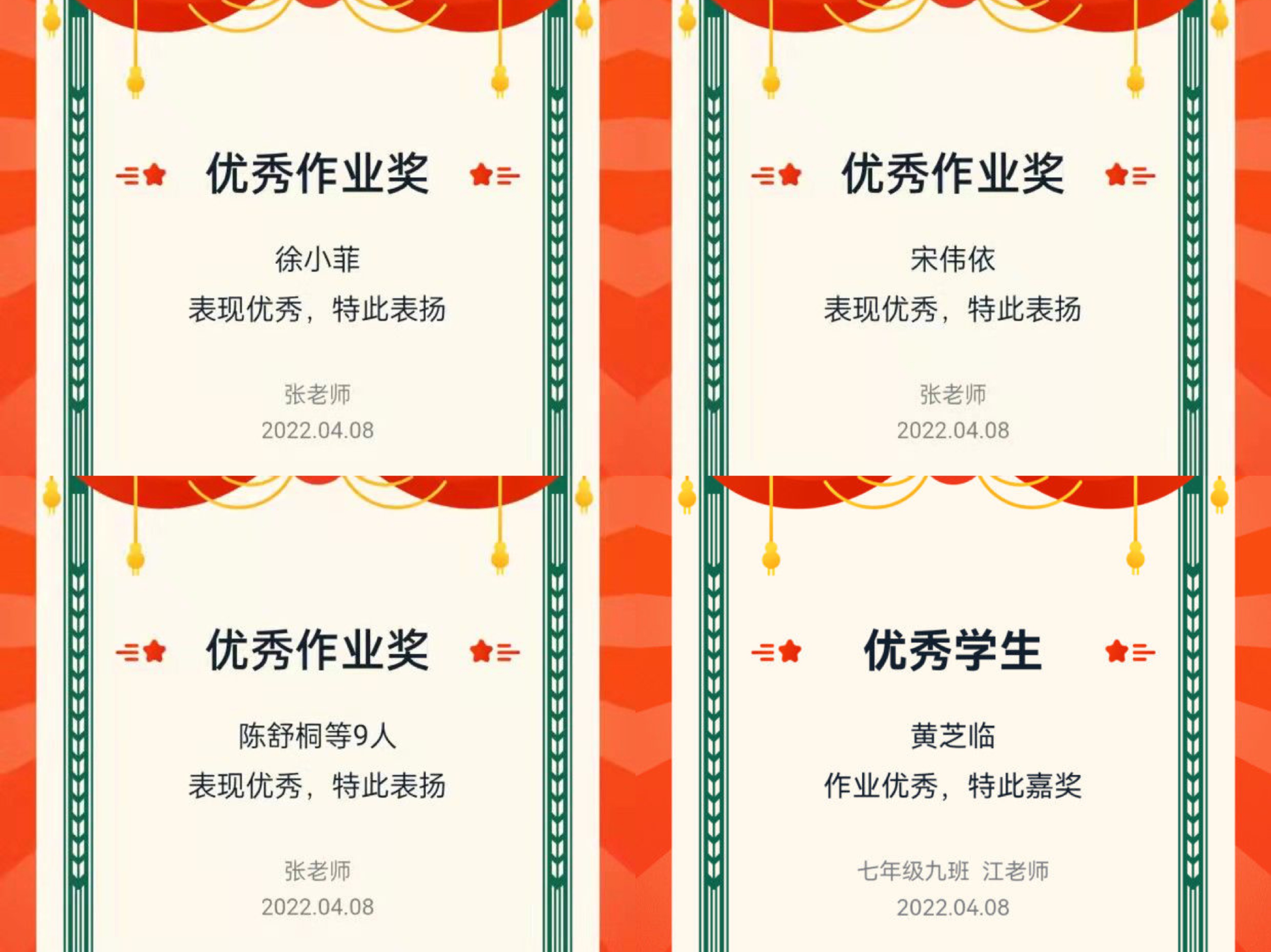 七年級(jí)充分結(jié)合線(xiàn)上教學(xué)方式,采用“電子獎(jiǎng)狀”的形式,對(duì)學(xué)生點(diǎn)滴成長(zhǎng)進(jìn)行鼓勵(lì),調(diào)動(dòng)學(xué)生學(xué)習(xí)的積極性,增強(qiáng)了學(xué)生學(xué)習(xí)的趣味性和主動(dòng)性。
