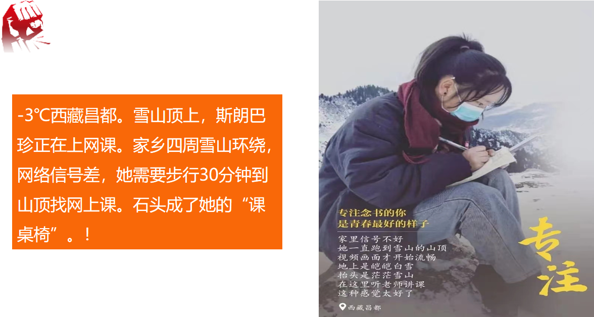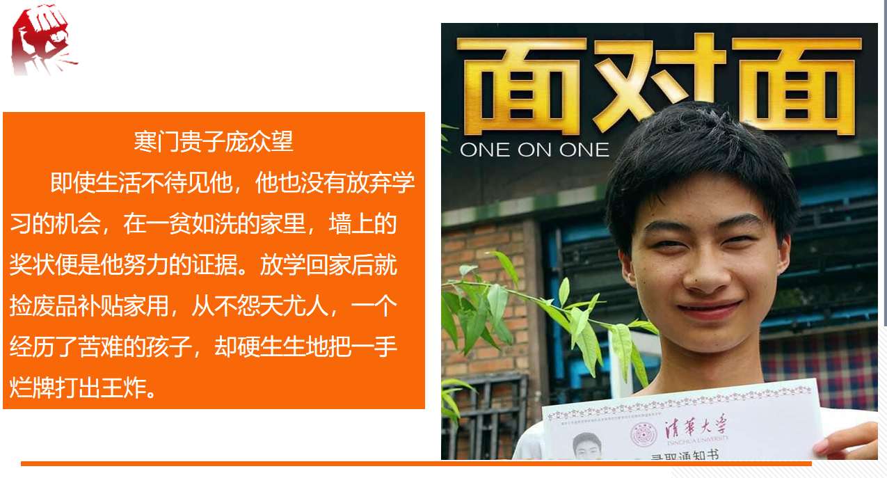 在班會(huì)課上,張老師首先讓同學(xué)們與自己的心靈進(jìn)行對(duì)話,去思考要成為一個(gè)怎樣的人:大到思考一下如何實(shí)現(xiàn)夢(mèng)想,小到自己平時(shí)學(xué)習(xí)方法的得失。在思考的過(guò)程中讓同學(xué)們領(lǐng)悟,認(rèn)真自律是同學(xué)們當(dāng)下首要的擔(dān)當(dāng)。接著,張老師為同學(xué)們講述了許多勵(lì)志求學(xué)的故事:住在西藏雪山頂?shù)乃估拾驼洳叫腥昼姷缴巾攲ふ揖W(wǎng)略信號(hào)上網(wǎng)課,安徽高三學(xué)子劉傳賀堅(jiān)持文化課和體能訓(xùn)練兩不誤、重慶“外賣小哥”毛召木憑借努力考上大學(xué)……他們通過(guò)自己的努力,承擔(dān)起了為中華之崛起而讀書(shū)的使命。
