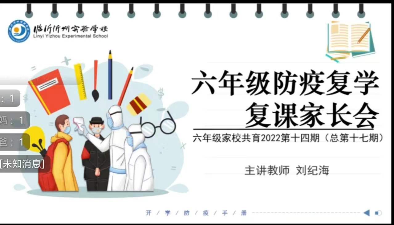 會(huì)議由四部分組成,劉紀(jì)海老師首先介紹目前的防疫形勢(shì)與假期防疫要求,希望家長(zhǎng)及時(shí)關(guān)注防疫動(dòng)態(tài),準(zhǔn)確理解防疫形勢(shì),做到“不信謠,不傳謠”,五一假期期間做到非必要不離蘭,如需外出,必做到社區(qū)、學(xué)?!半p報(bào)備”;其次介紹復(fù)學(xué)準(zhǔn)備工作,分別從學(xué)校、家長(zhǎng)及學(xué)生方面詳細(xì)展開,確保家長(zhǎng)明悉復(fù)學(xué)準(zhǔn)備工作,增強(qiáng)家長(zhǎng)對(duì)學(xué)校工作的理解;然后介紹復(fù)學(xué)后的防疫常規(guī)要求,事無巨細(xì),詳細(xì)介紹測(cè)溫、口罩佩戴、學(xué)生接送等各類事項(xiàng)的防疫規(guī)范;最后介紹其他重要安全工作,分別從防溺水、交通安全、網(wǎng)絡(luò)安全、心理健康安全四方面展開,力圖緩解家長(zhǎng)焦慮,保證學(xué)生安全。