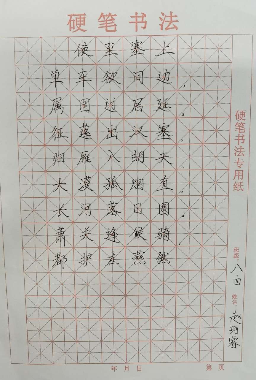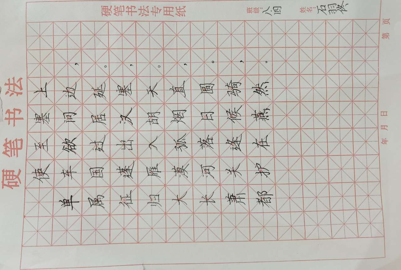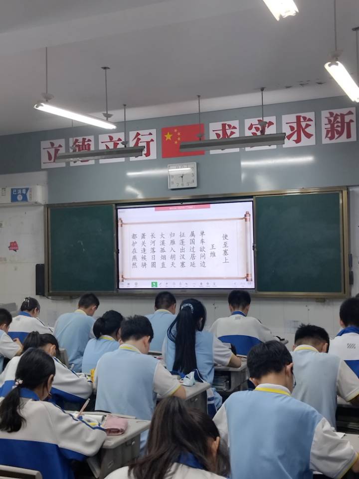 比賽過程中,八年級全體學(xué)生于各班教室在統(tǒng)一下發(fā)的紙張上現(xiàn)場書寫唐詩《使至塞上》。有書法基礎(chǔ)或書法愛好的學(xué)生根據(jù)自己的特點書寫相應(yīng)的“書體形式”上交,年級召集組委會成員對參賽作品進行篩選,評出優(yōu)秀作品并頒發(fā)榮譽證書以資鼓勵。