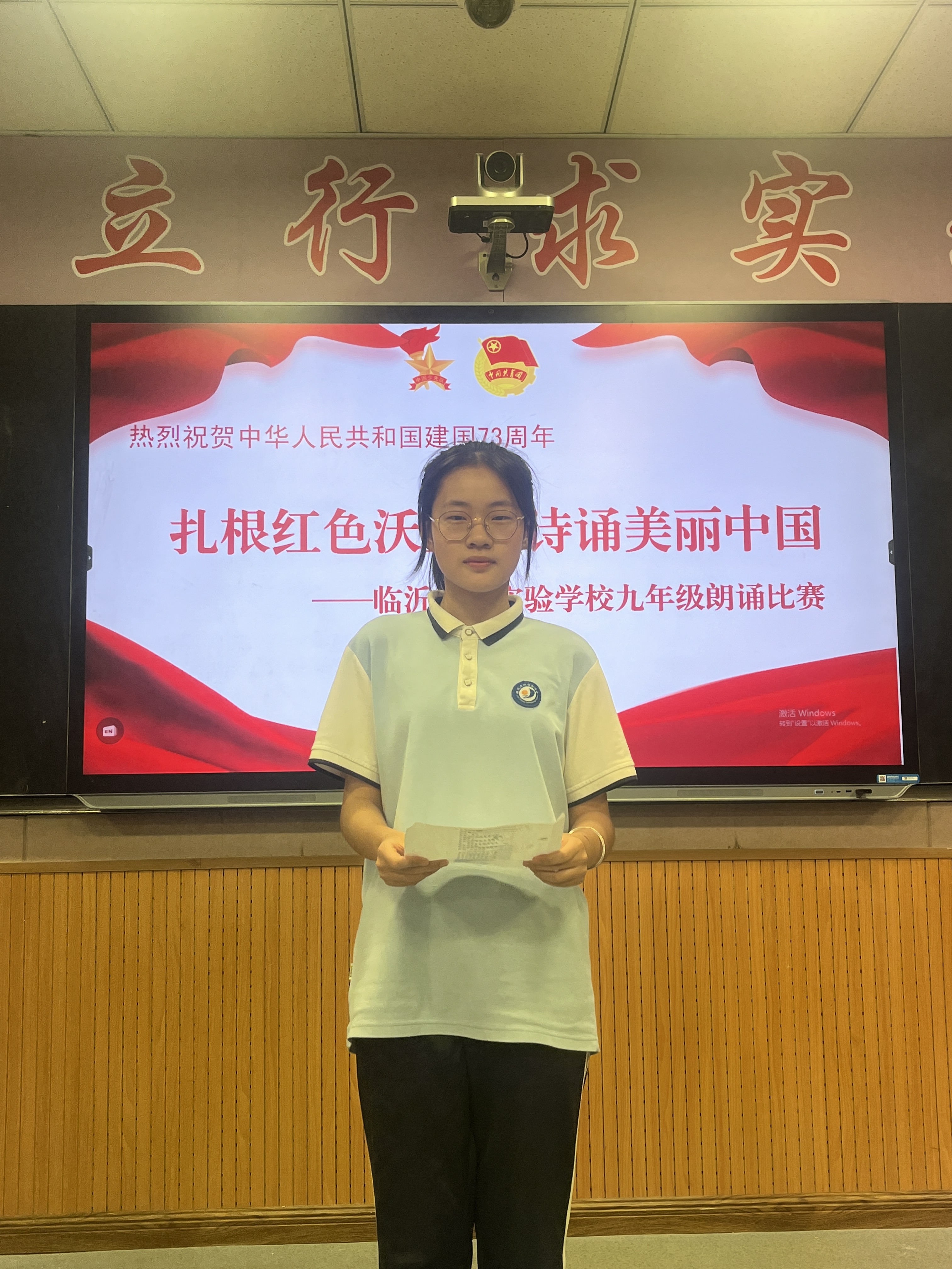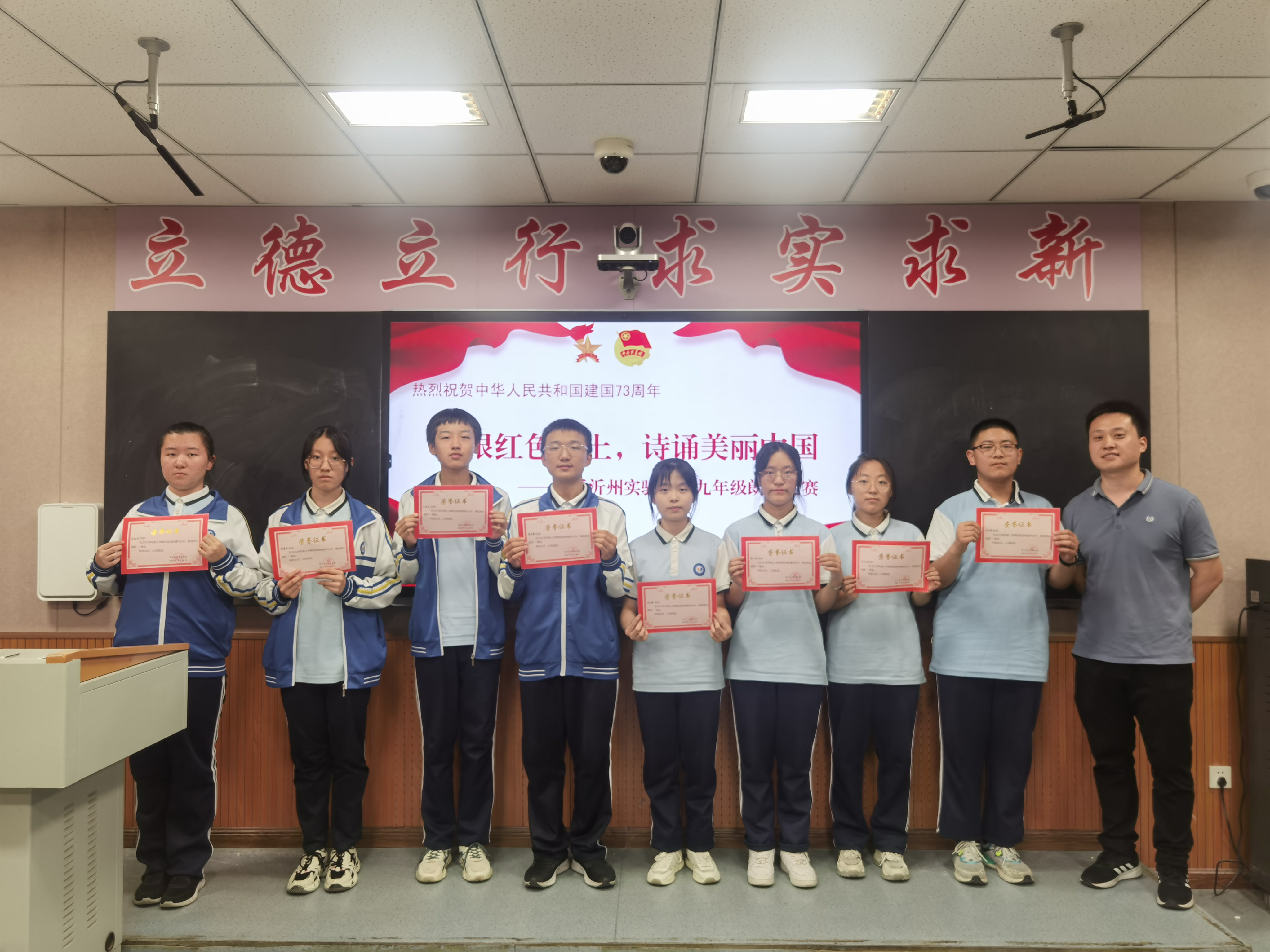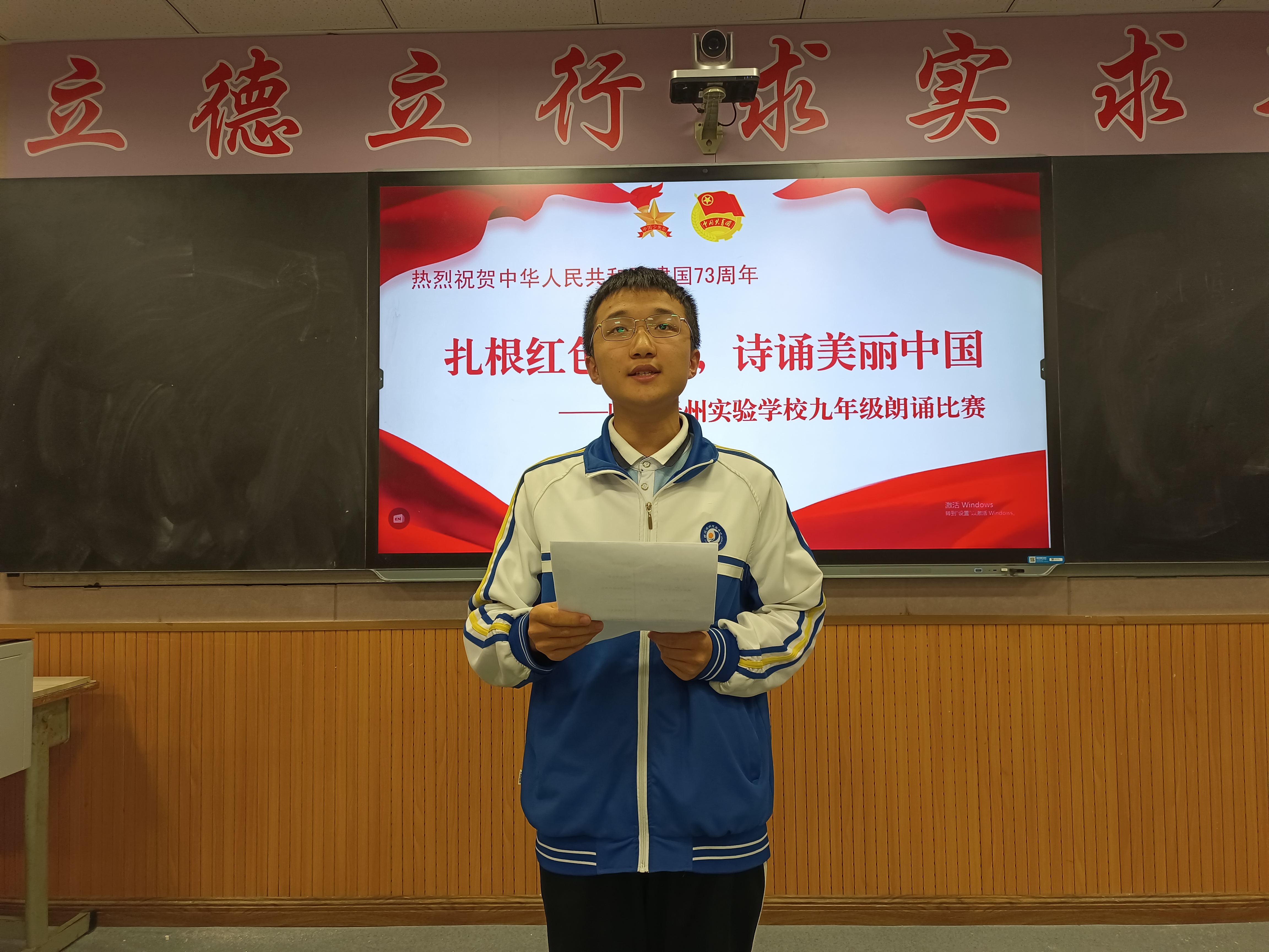為號(hào)召我校青少年以最飽滿的熱情迎接黨的二十大勝利召開,慶祝中華人民共和國成立73周年,引導(dǎo)廣大青少年在傳承中華優(yōu)秀傳統(tǒng)文化中詮釋愛國之理、涵養(yǎng)愛國之德、砥礪愛國之志、激發(fā)愛國之情。2022年9月30日,我校九年級開展了“扎根紅色沃土,詩誦美麗中國”朗誦比賽。