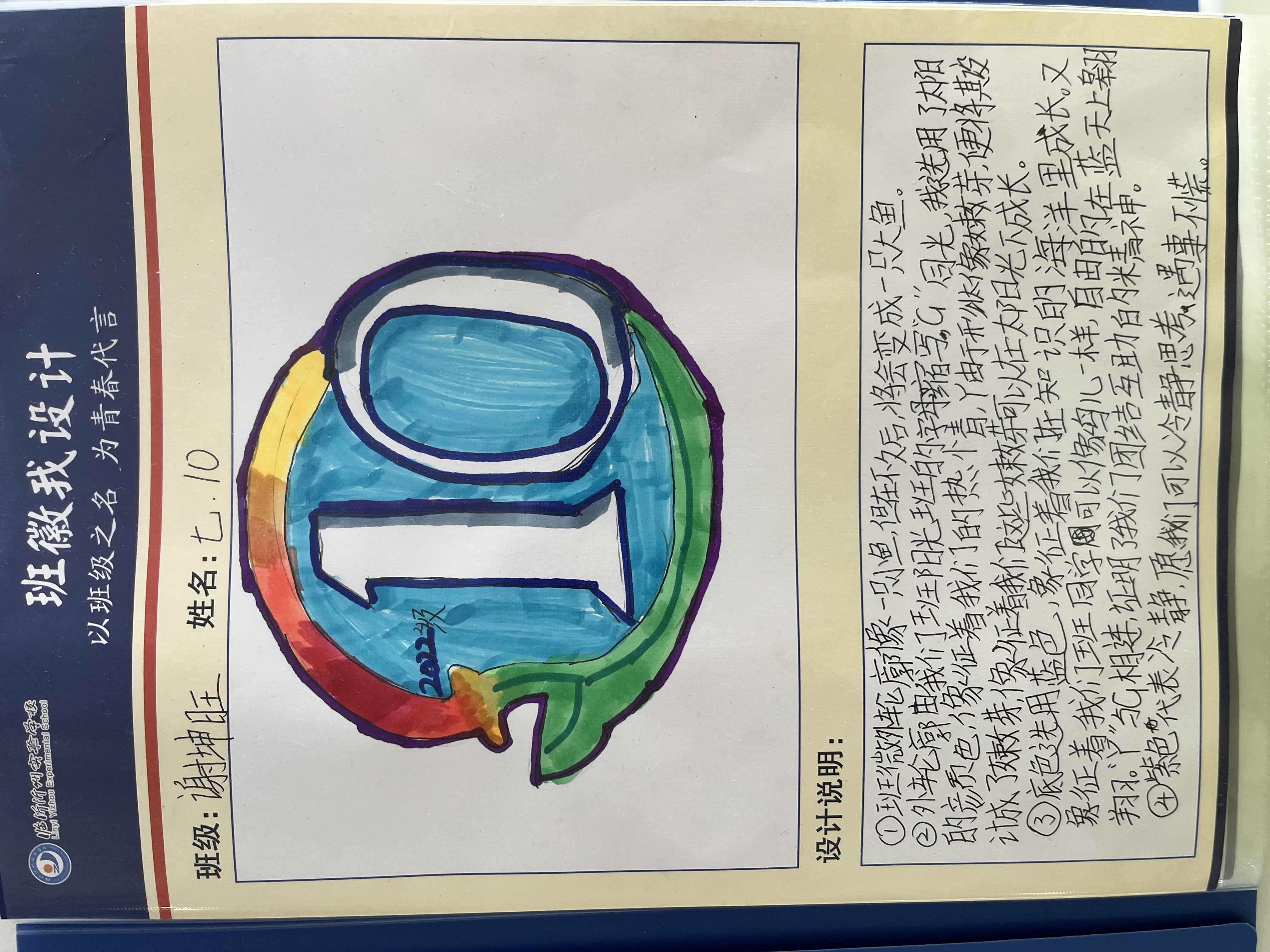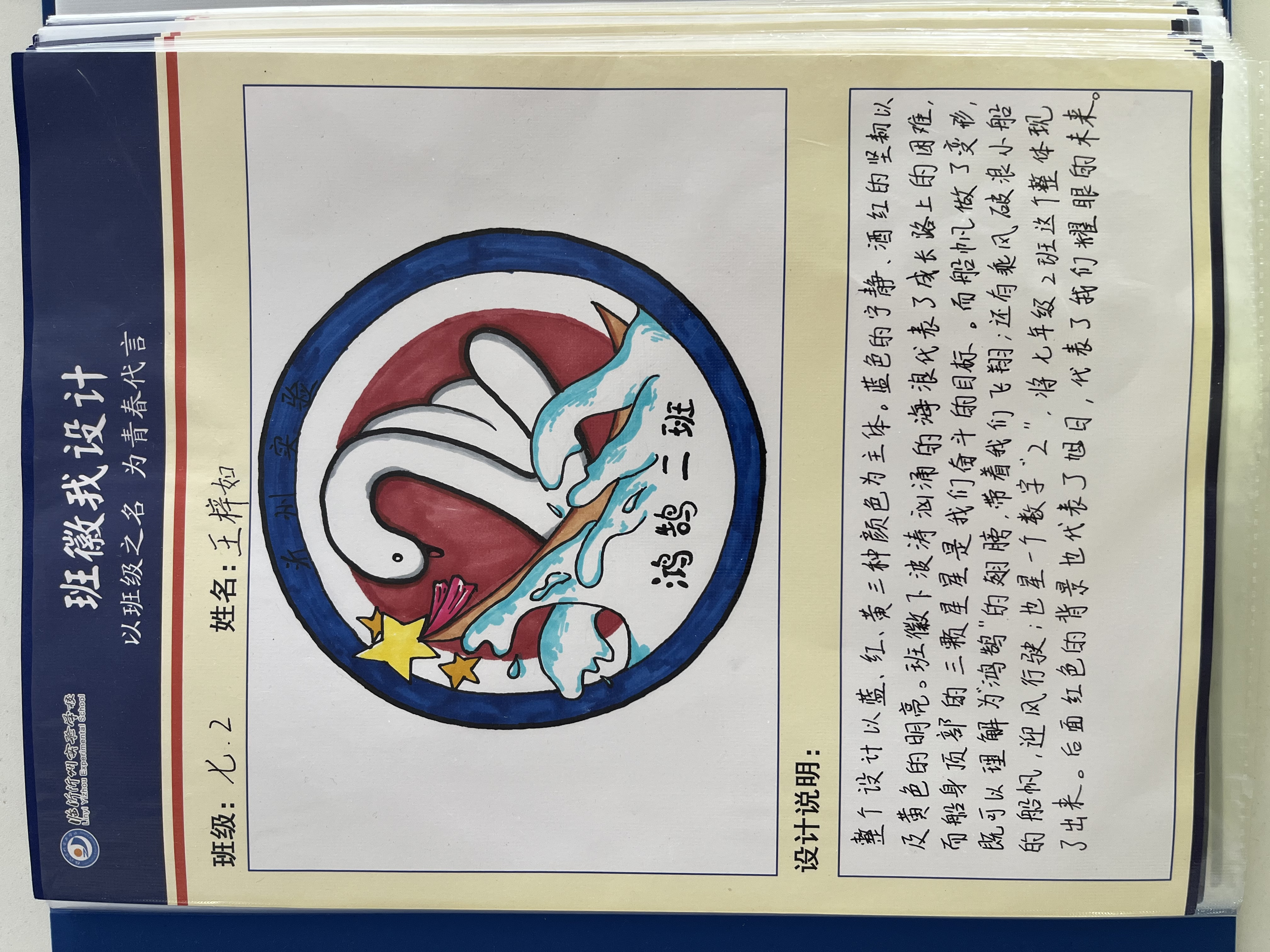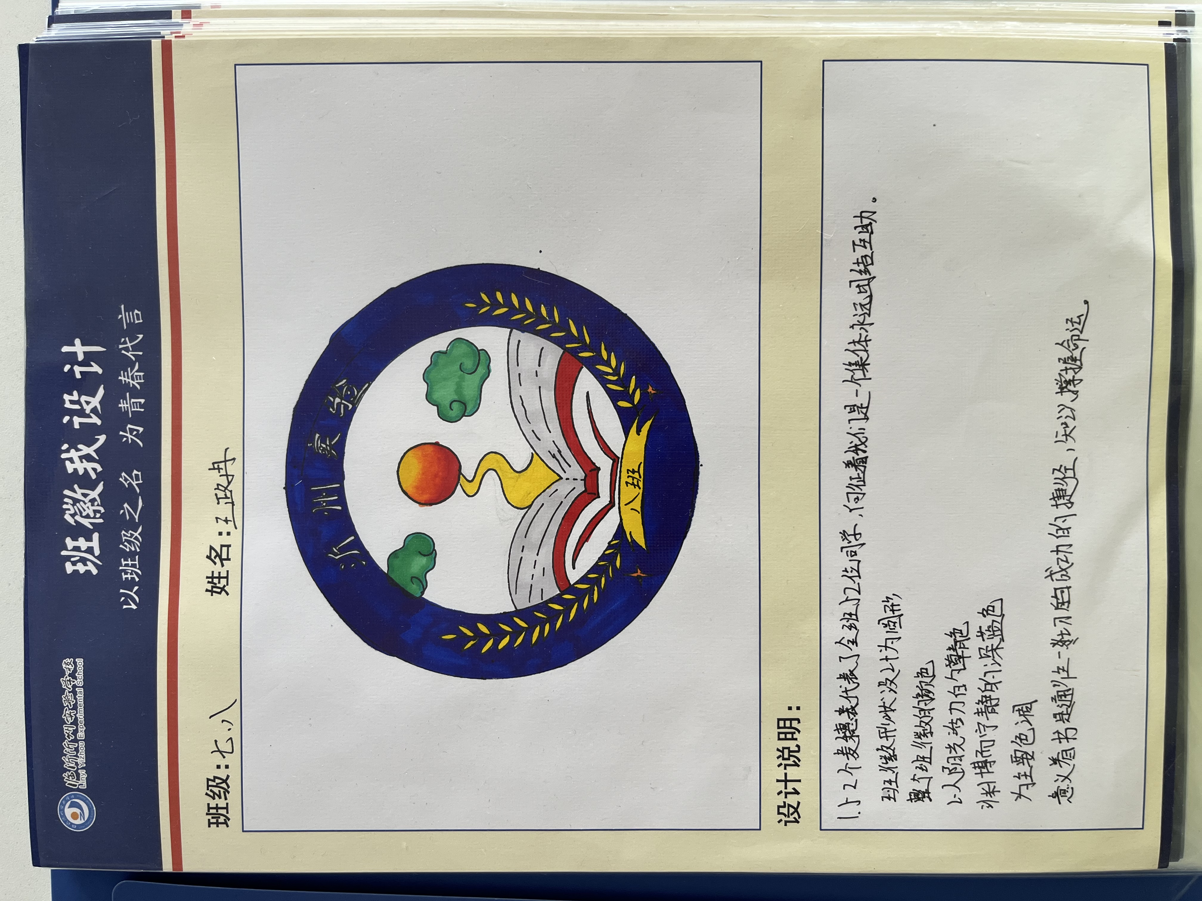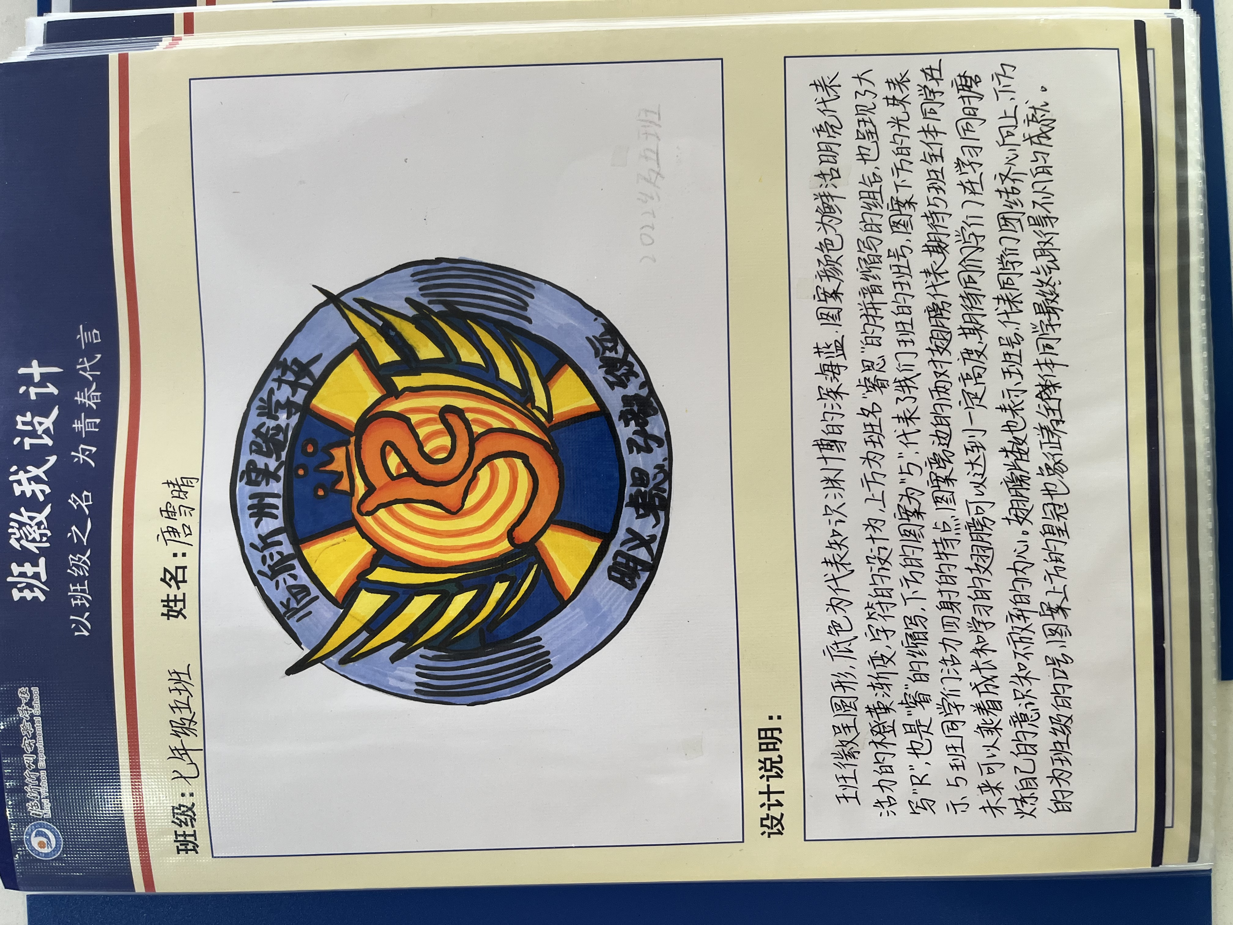 班級,滿載著歡聲笑語與溫暖感動;班徽,是班級精神的圖案表達,承載了大家對班級深厚的感情,凝聚了同學們卓越的智慧。同學們通過巧妙的構思和設計,將具有象征意義的線條、色彩、文字進行組合,構成了文化內涵和精神底蘊十分豐富的圖形。班徽是言(文字)、象(意象)、意(寓意)的結合體,代表了班級的精神和價值取向,是班級的標志和象征。