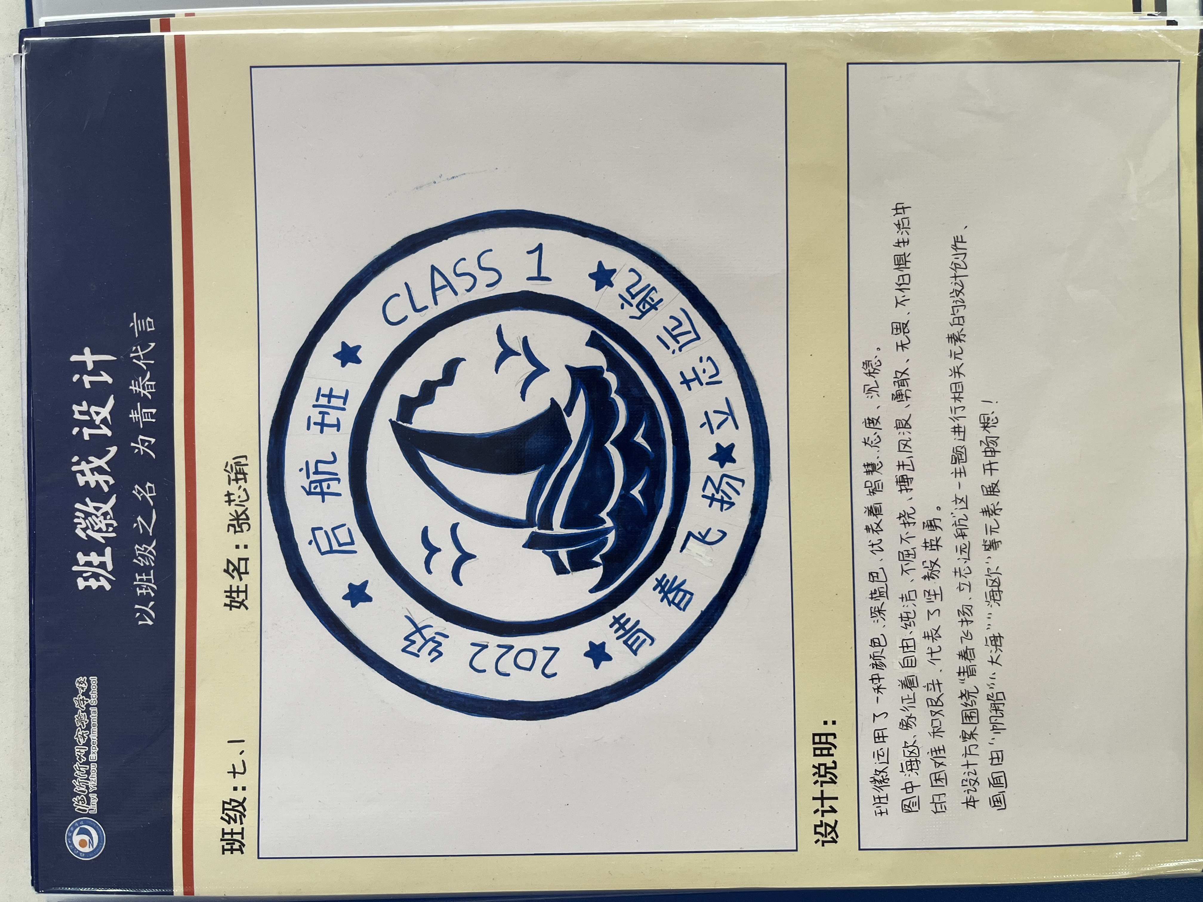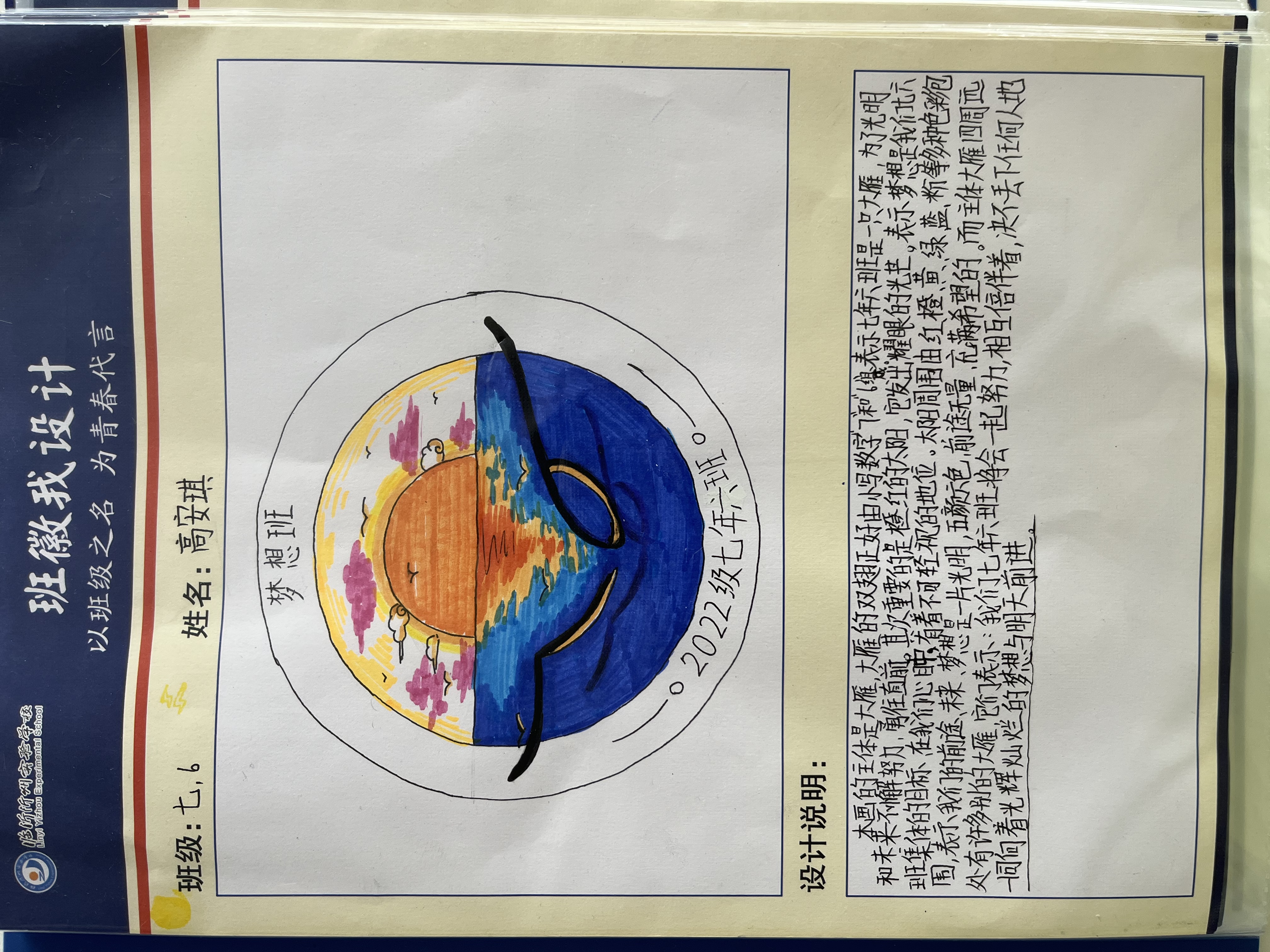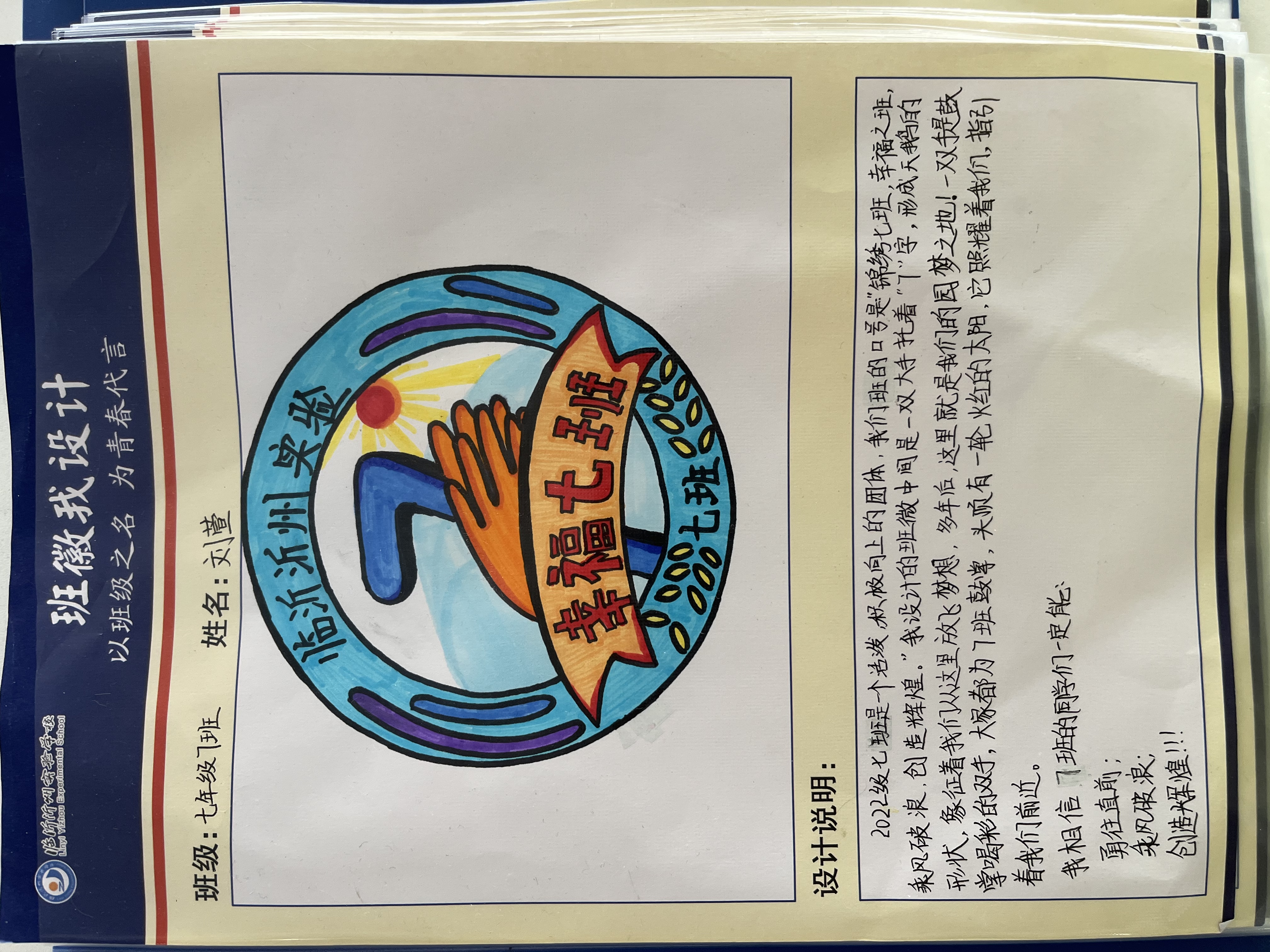 為促進班級之間的了解,增進同學之間的友誼,共塑班級榮譽感和集體感,提高班級凝聚力,2022年10月,沂州實驗學校七年級舉辦了班徽設計活動,將美育融入到班級文化建設中,七年級全體同學參加了這次活動。在設計班徽的過程中,同學們盡情發(fā)揮自己的創(chuàng)造力與想象力,將班名、班級理念等元素嵌入對班徽的理解和期望中。