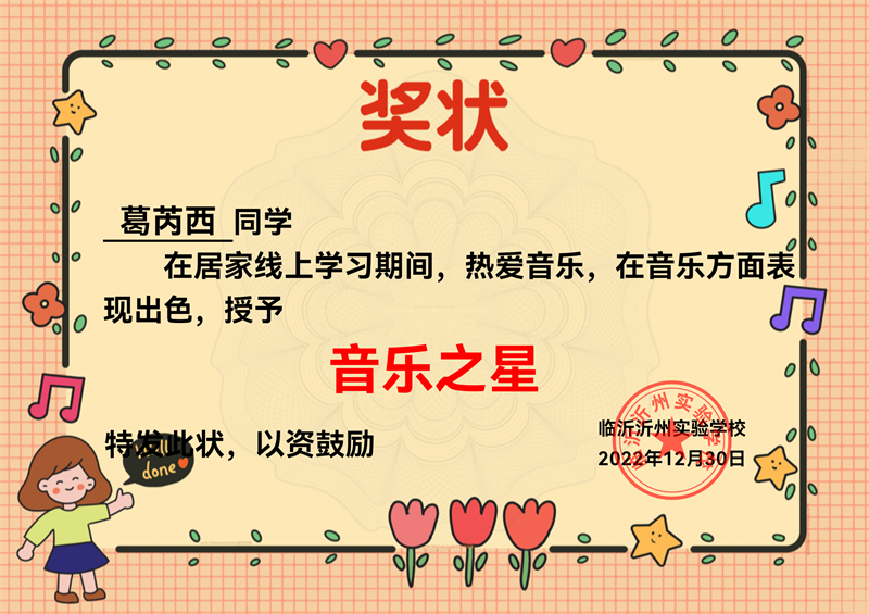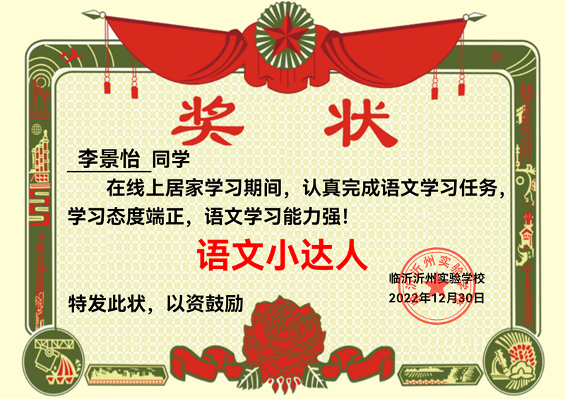 期末來臨,學校特組織線上課程優(yōu)秀學生評選活動,為表彰先進,激勵后進,營造比、學、幫、超的學習氛圍,引導全體學子向身心健康、勞動積極、學習習慣優(yōu)良等方面全面發(fā)展。根據(jù)學校學生獎勵規(guī)定,本次表彰評選方式采用家長和任課老師雙向推薦,班主任審核的形式進行。本次表彰項目有潛力之星,自律之星,語文小達人,數(shù)學小達人,繪畫之星,音樂之星,體育之星,探究之星,小小書法家,勞動小能手共十項。在元旦期間,以問卷的形式,邀請家長和孩子參與,最后給孩子頒發(fā)電子獎狀和紙質獎狀。