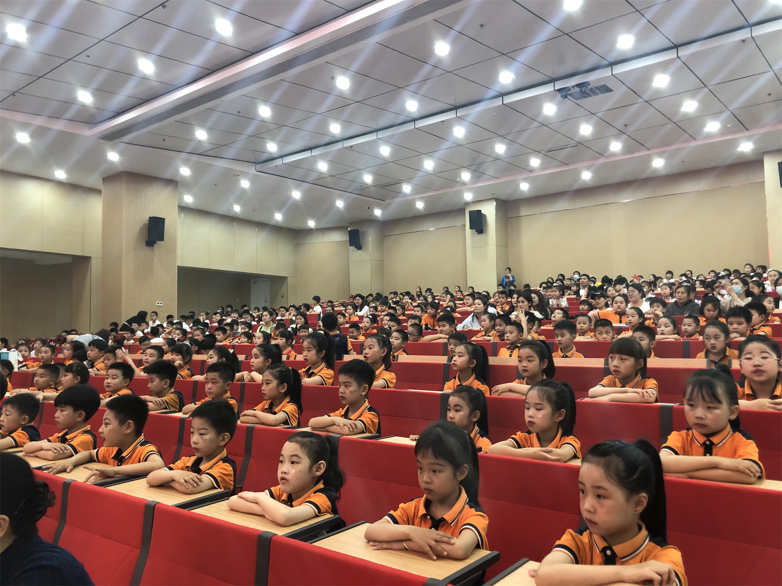 鮮紅的隊旗迎風飄揚,我們在這里歡慶自己的節(jié)日,用歌聲蕩起歡樂的海洋。朱崇帥老師、常如老師、季易辰同學、沈書文同學盛裝出席,化身主持人,比賽在昂揚的樂曲聲中拉開了帷幕。副校長張福生發(fā)表了激情昂揚的講話,向小朋友們表達最真摯的祝愿和問候,希君生羽翼,一化北溟魚,并邀請同學們一起發(fā)出錚錚誓言:請黨放心,強國有我!