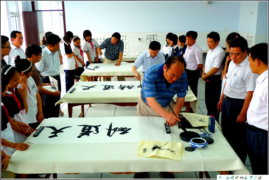 6月1日,我校隆重舉行了2012藝術(shù)節(jié)暨六一慶祝大會(huì),省人大常委會(huì)科教文衛(wèi)委員會(huì)副主任委員、臨沂市關(guān)工委主任朱紹陽出席大會(huì),臨沂市政協(xié)副主席李作良出席大會(huì)并做了重要講話。會(huì)后,清華大學(xué)美術(shù)學(xué)院錢守寬書法工作室導(dǎo)師、臨沂市直書協(xié)副主席錢守寬,市直書法家協(xié)會(huì)副主席常巨山、市直書法家協(xié)會(huì)副主席王經(jīng)耀等著名書法家,與我校部分師生在書法教室進(jìn)行聯(lián)誼,舉行筆會(huì)。眾位藝術(shù)家飽蘸激情,揮毫潑墨,為我校留下了多幅藝術(shù)佳作。同時(shí),眾位藝術(shù)家對我校書法社團(tuán)師生書法練習(xí)情況進(jìn)行了有針對性的指導(dǎo),并對我校書法教育工作提出了寶貴的建議。此次書法筆會(huì),對我校更進(jìn)一步的推動(dòng)書香校園的建設(shè)起到了積極作用,也為我校打造書法特色名校奠定了堅(jiān)實(shí)的基礎(chǔ)。