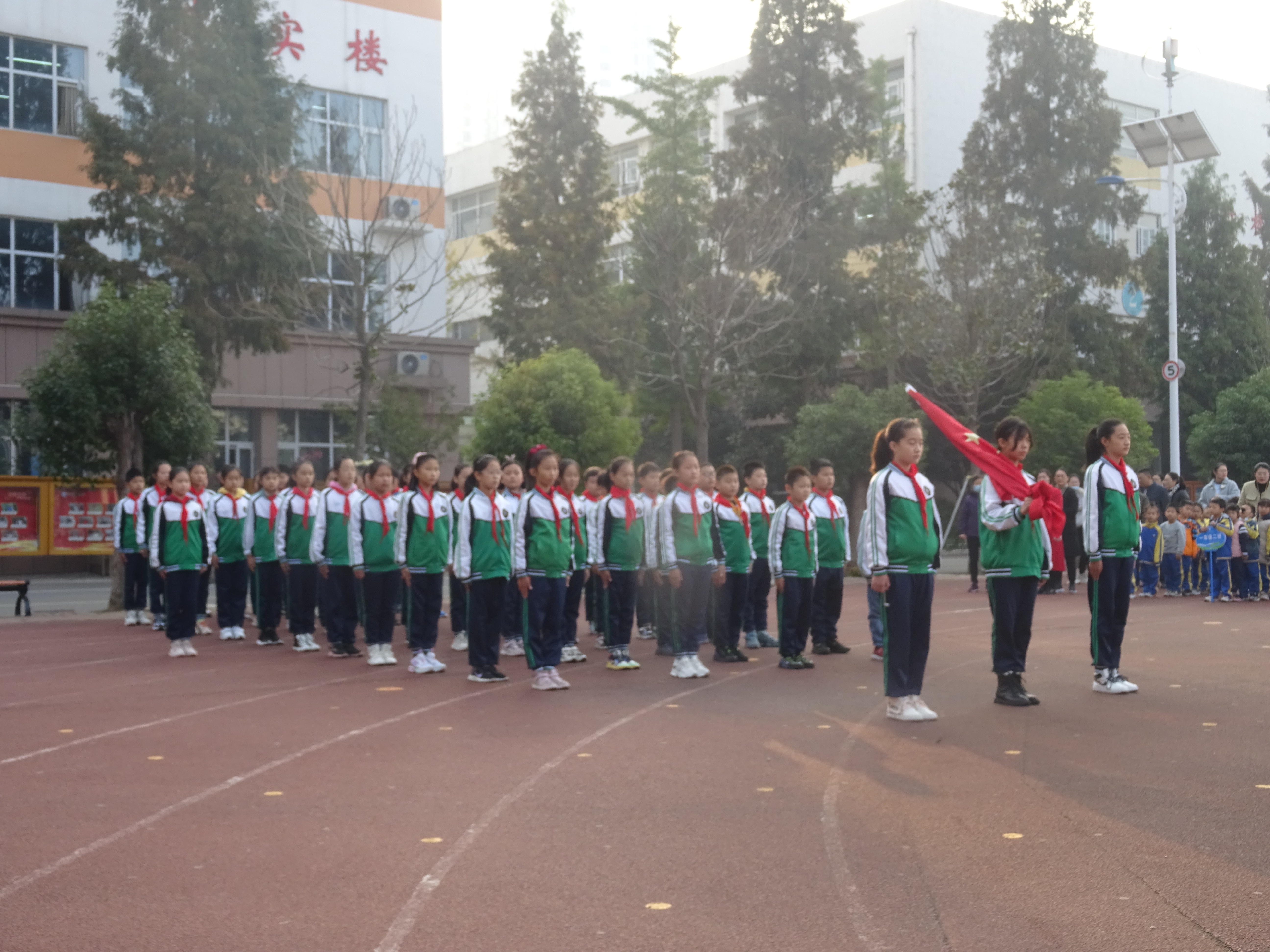 接著,鮮艷的五星紅旗冉冉升起,陳雪慶老師指揮全校師生共唱國(guó)歌。