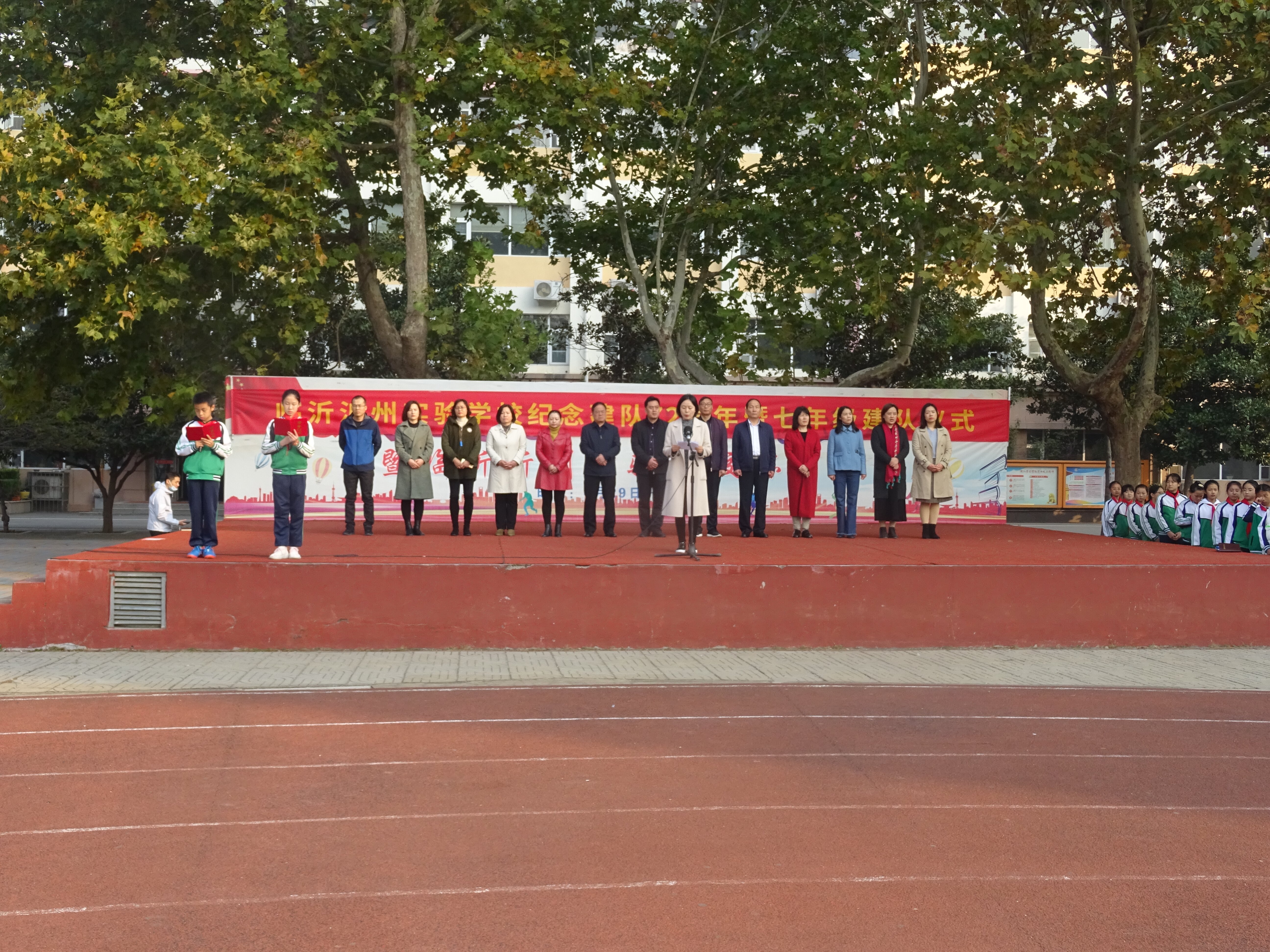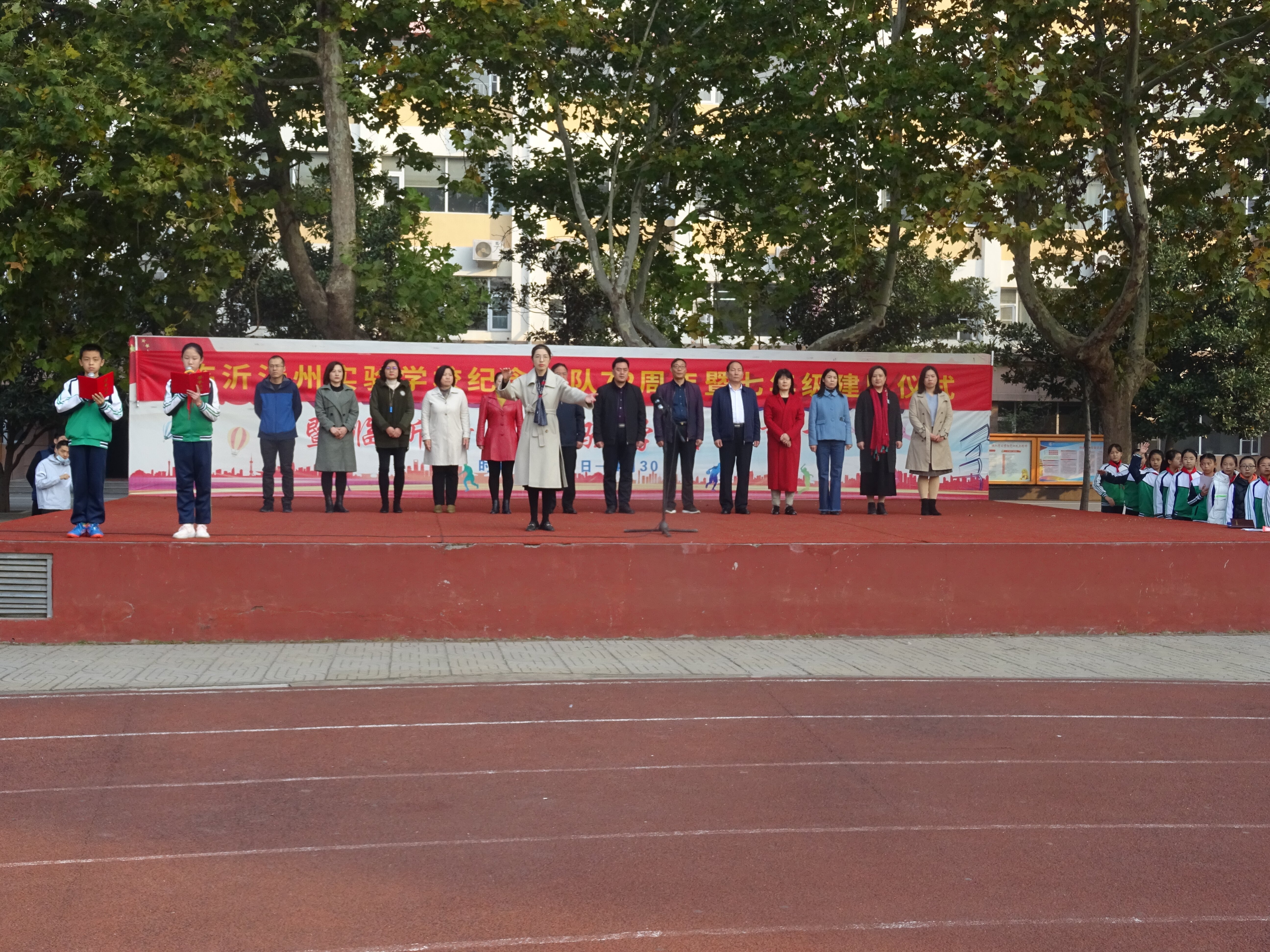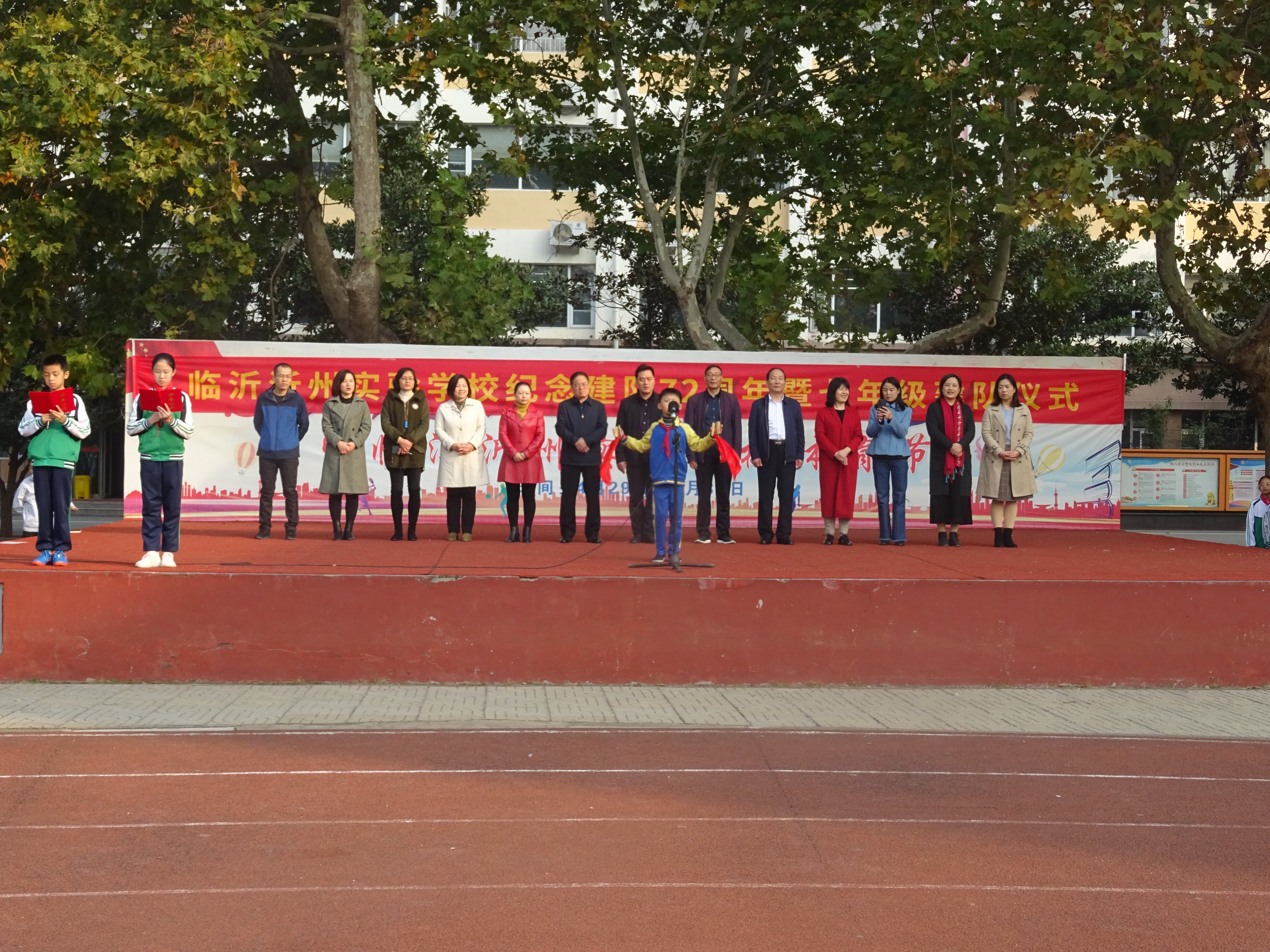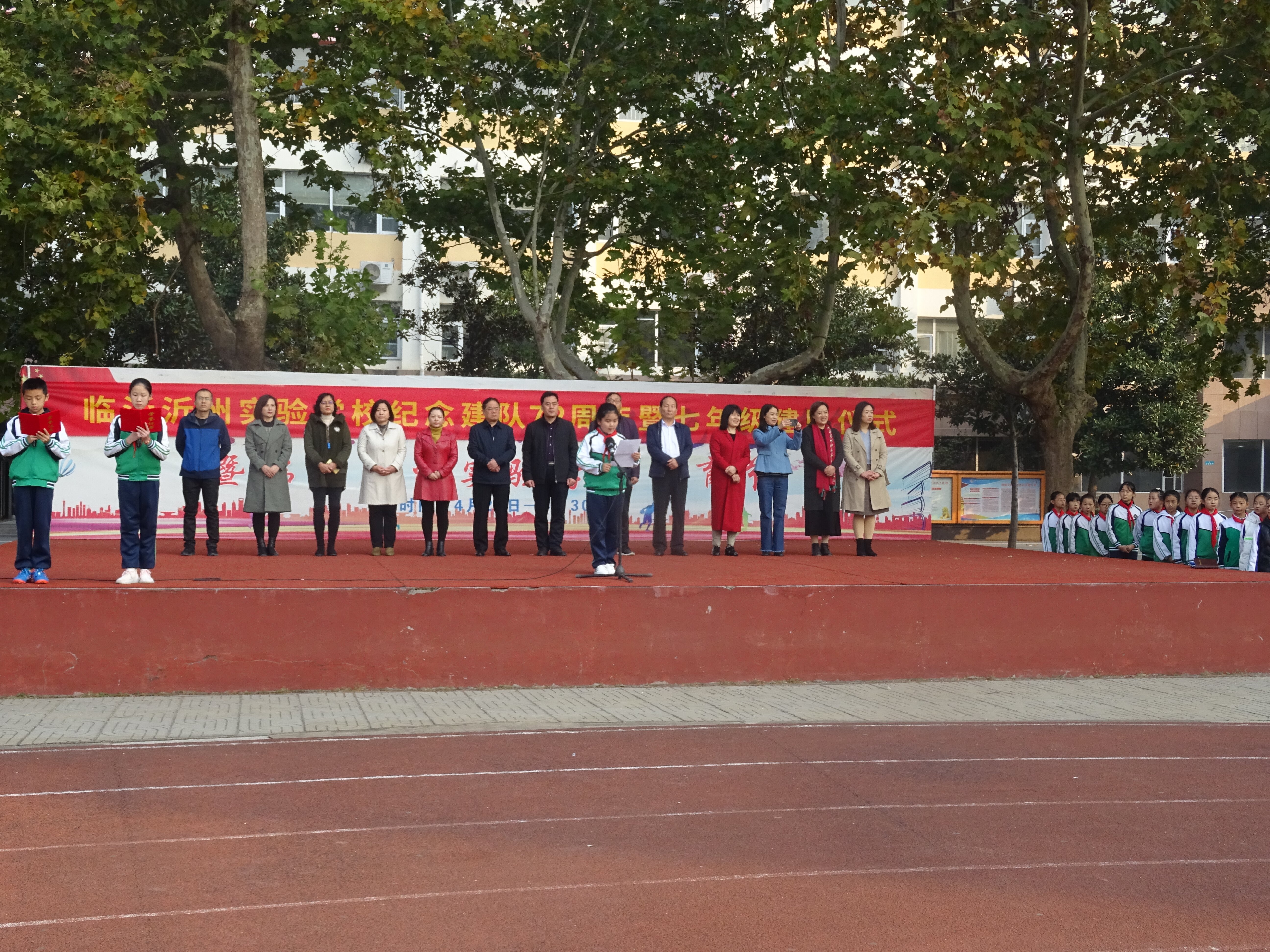 伴隨著莊嚴(yán)的出旗曲,五、四班護(hù)旗隊(duì)整齊出場(chǎng),他們個(gè)個(gè)精神飽滿(mǎn)、身姿挺拔,彰顯出沂州學(xué)子特有的活力。