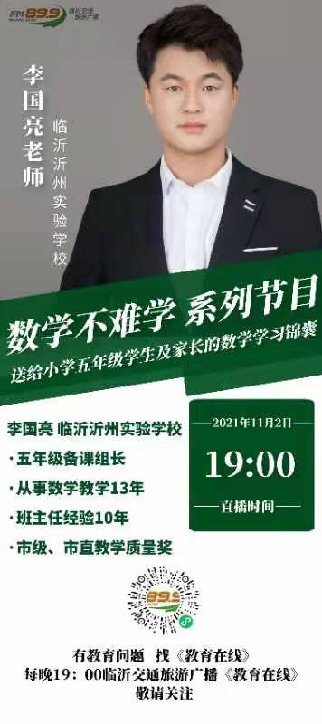 我校五年級(jí)優(yōu)秀數(shù)學(xué)老師李國(guó)亮于11月2日晚19:00時(shí),應(yīng)邀做客臨沂交通旅游廣播《教育在線》節(jié)目,與廣大聽(tīng)眾朋友深入交流了五年級(jí)數(shù)學(xué)的學(xué)習(xí)錦囊,節(jié)目播出后,引起強(qiáng)烈反響和廣泛專注。