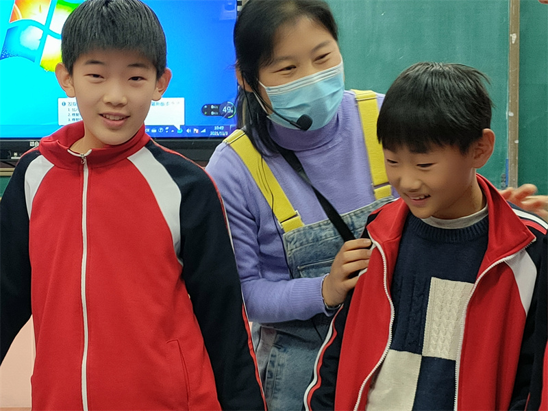 為了縮短與學(xué)生之間的心理距離,姜秀梅老師首先組織了一場名為“大風(fēng)吹”的暖身活動(dòng),既活躍了課堂,也降低了師生間的陌生感。隨后,她展開了心理活動(dòng)——“心有千千結(jié)”。她讓孩子們手牽手圍成圓圈,記住左右手所牽的伙伴,松手,閉眼,自由行走五步,隨后睜眼,在原地再次牽起原來伙伴的手。在不松手,不打亂現(xiàn)有位置順序的情況下,她讓學(xué)生想辦法解開與其他同學(xué)之間的“結(jié)”,直至恢復(fù)到最初的圓圈狀態(tài)。孩子們討論著,思考著,配合著,“解結(jié)”顯然成為了一種樂趣。