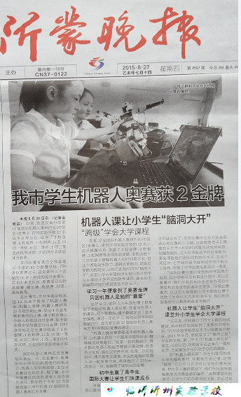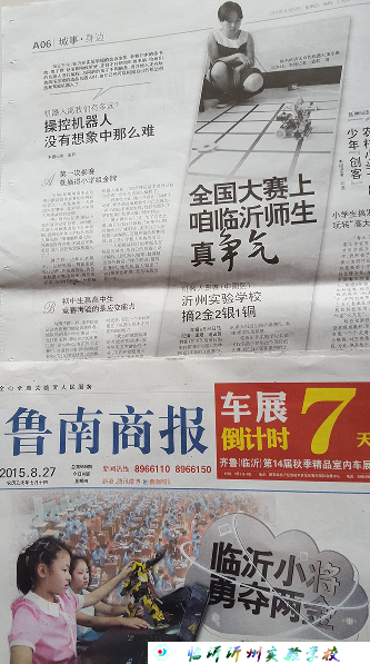 我校學生武漢機器人比賽回來后,8月26日,《沂蒙晚報》、《魯南商報》兩家媒體來我校對部分參賽學生進行了專訪,并于8月27日分別予以報道?!遏斈仙虉蟆钒盐倚W生獲獎的新聞放在頭版頭條。